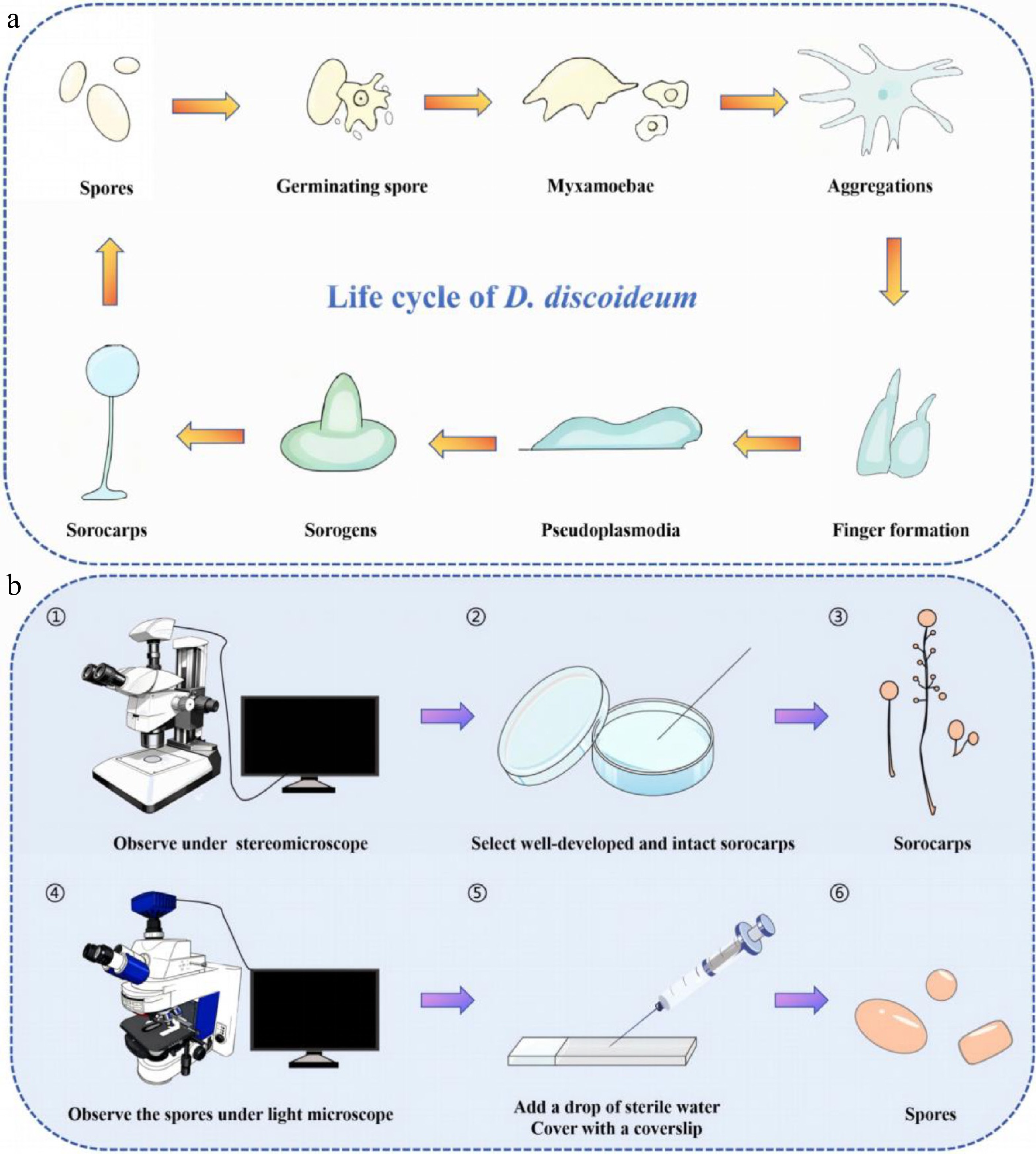 (a) The amoebae of D. discoideum persist across the organism's complete life cycle. (b) The steps involved for observing spores.