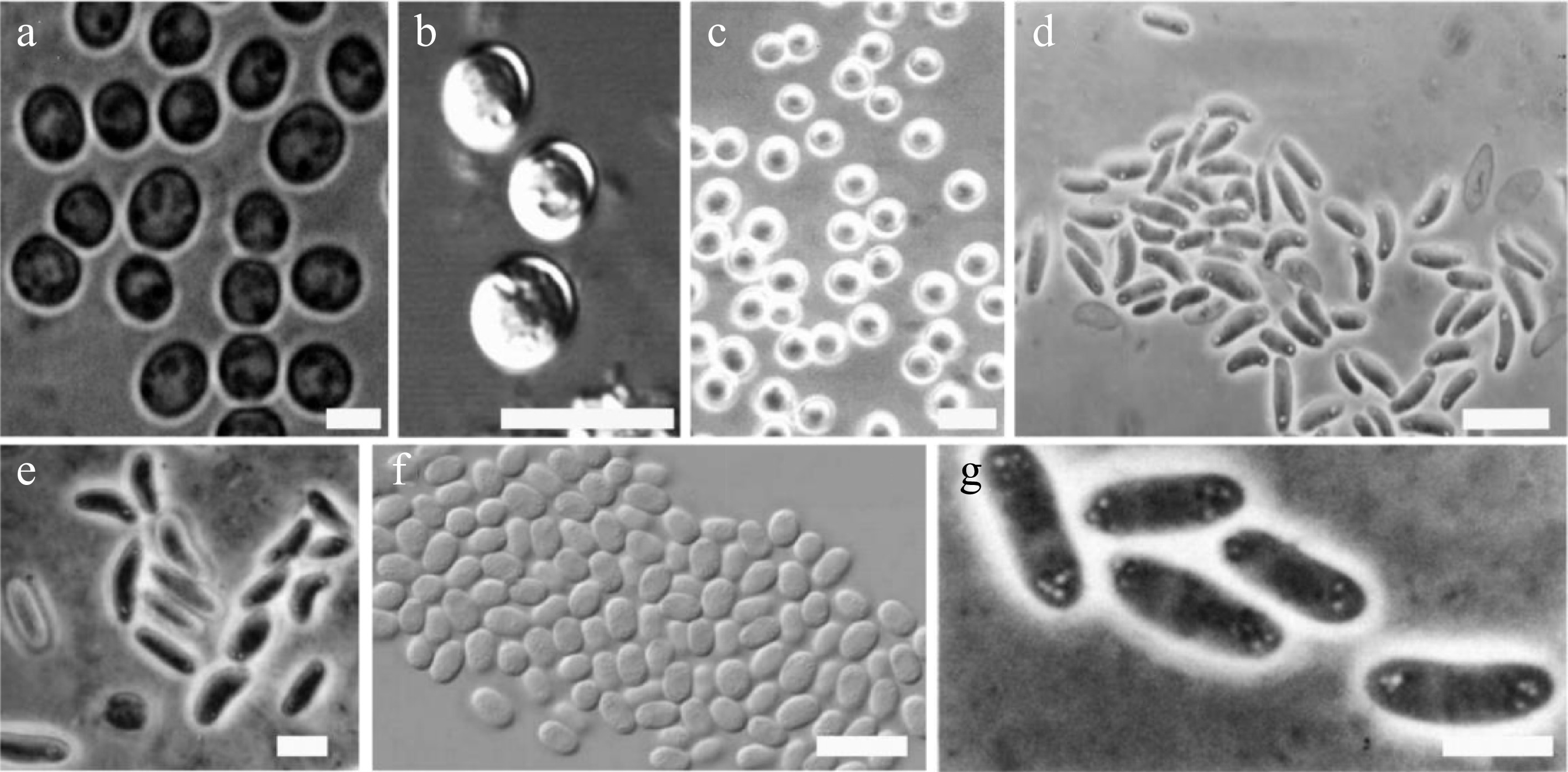 Examples of different dictyostelid spore shapes (all the images are from the corresponding references). (a) Dictyostelium globisporum spores. Bar = 5 μm[18]. (b) D. minimum spores. Bar = 10 µm[19]. (c) Heterostelium equisetoides. Bar = 10 μm[20]. (d) Cavenderia boomerangispora, long and frequently curved PG+. Bar = 10 μm[23]. (e) H. naviculare, elongated navicular spores with consolidated polar granules. Bar = 5 μm[27]. (f) H. flexuosum, relatively small spores, note the widely distributed, numerous unconsolidated granules. Bar = 10 μm[23]. (g) D. polycarpum, group of spores with polar spore granules PG. Bar = 5 μm[30].