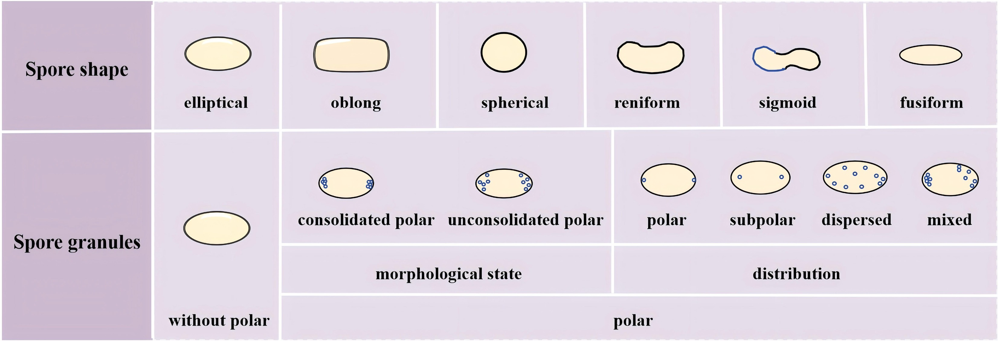 Spores of species of dictyostelids exhibit significant morphological diversity, with variations in shape, size, and specific morphological features among different genus and species. The characteristics can be summarized from four dimensions: common morphology, special morphology (Fig. 3), size variation, and length-breadth (L/B) ratio, as outlined in the sections that follow.