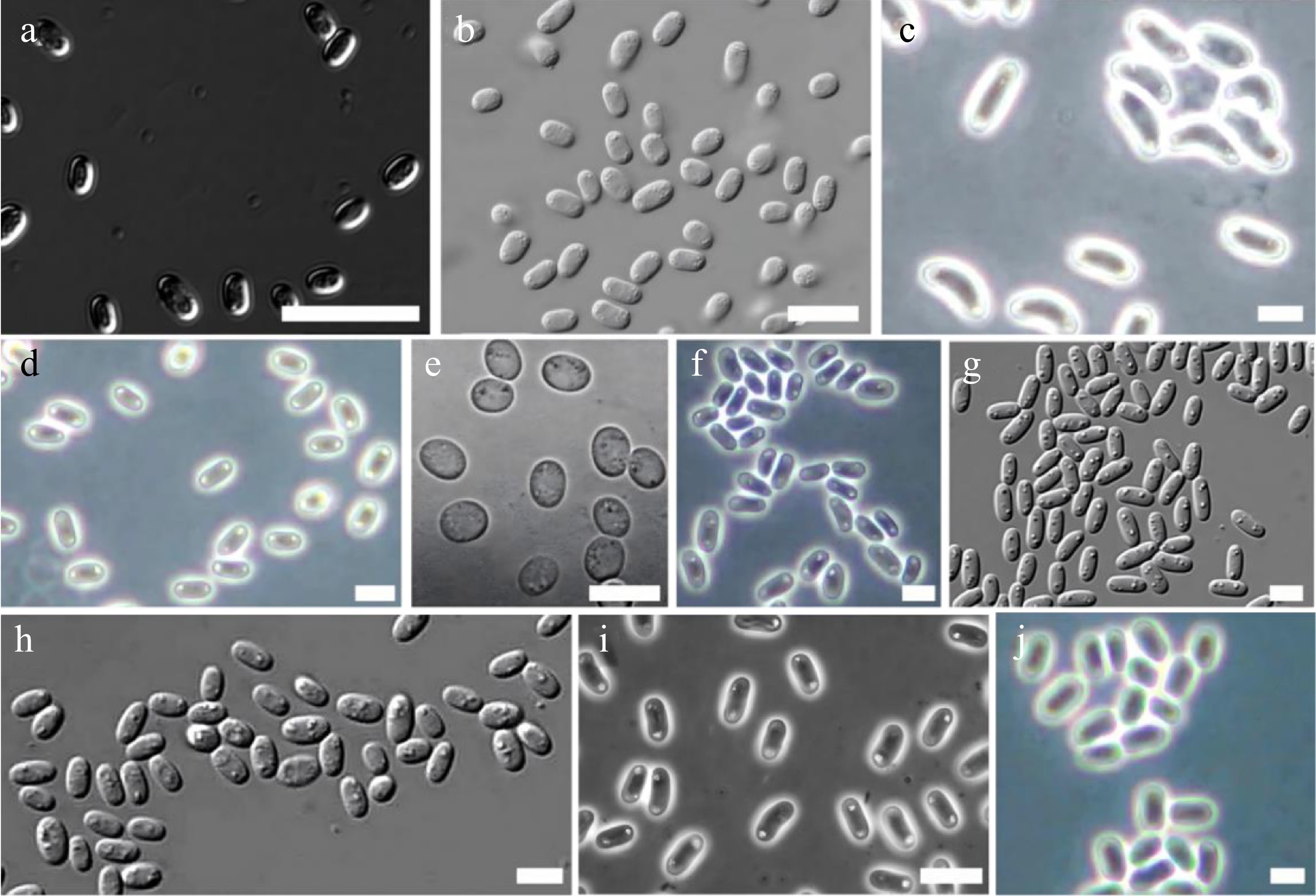 Examples of different dictyostelid spore granules (all the images are from the corresponding references). (a) Dictyostelium robusticaule. Bar = 20 μm[34]. (b) Heterostelium stolonicoideum, oblong spores note the conspicuous unconsolidated polar granules. Bar = 10 μm[23]. (c) Raperostelium cymosum, large elliptical, mostly reniform spores with conspicuous consolidated polar to subpolar granules. Bar = 6 μm[37]. (d) Cavenderia fulva, elliptical spores with prominent refractive consolidated granules at their poles. Bar = 5 μm[37]. (e) R. ibericum. Bar = 10 μm[38]. (f) C. minima, small elliptical irregular spores with polar to subpolar consolidated granules, generally the cluster of granules appears larger at one of the poles. Bar = 6 μm[37]. (g) D. capillare, elliptical spores with conspicuous, consolidated polar granules. Bar = 5 μm[32]. (h) D. unicornutum, broadly elliptical spores with polar and subpolar granules. Bar = 5 μm[32]. (i) C. bhumiboliana, rather large, elliptical spores with consolidated polar granules. Bar = 10 μm[39]. (j) Hagiwaraea irregularibrachiatum, elliptical short spores with small unconsolidated polar to subpolar granules. Bar = 6 μm[37].