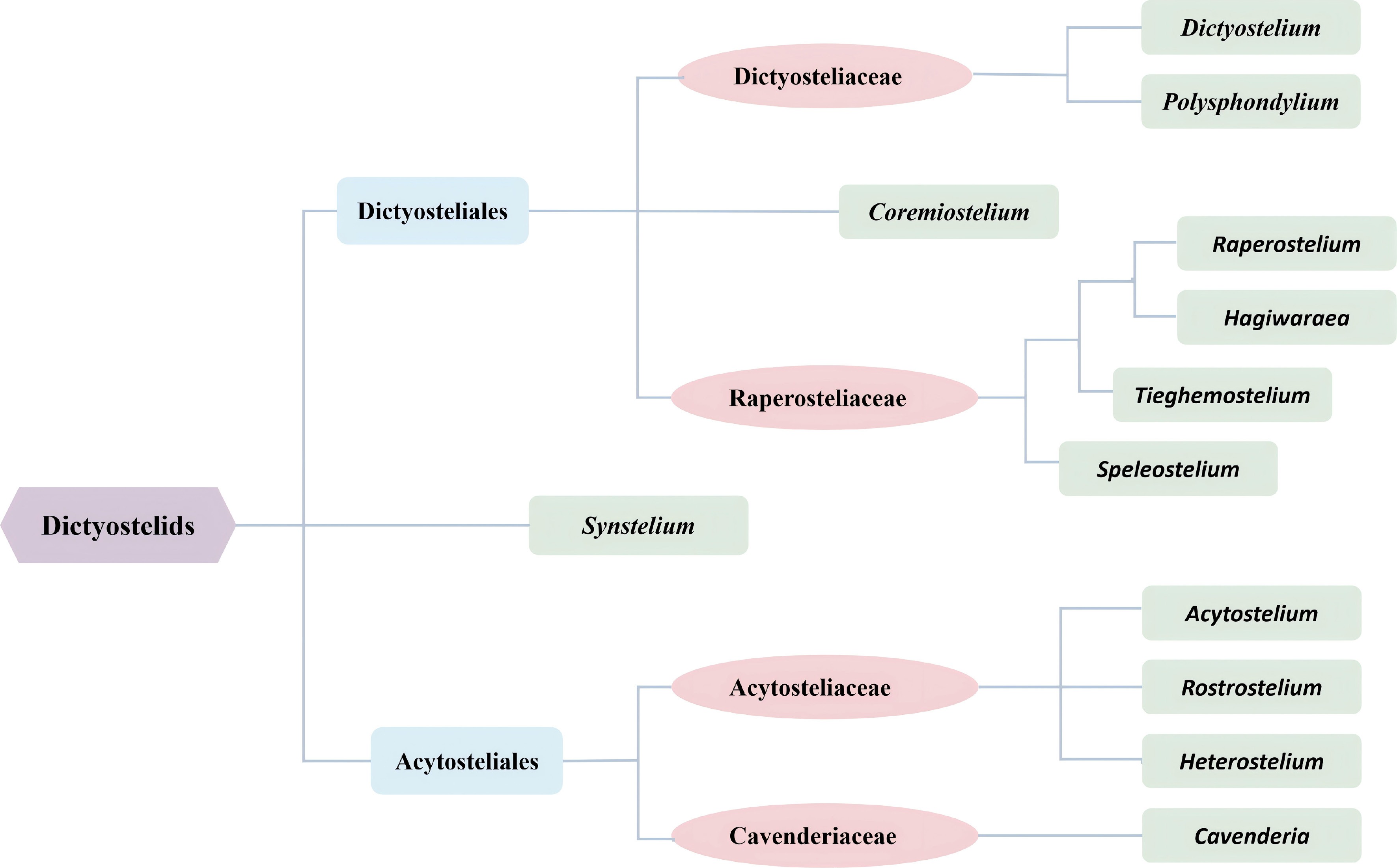 More than half of all species of dictyostelids lack polar granules. Species with conspicuous polar granule includes Dictyostelium polycarpum, D. recurvibasicum, D. robusticaule (Fig. 4a), D. globisporum, Raperostelium gracile, Heterostelium stolonicoideum (Fig. 4b), Cavenderia aureostipes, and C. exigua[23,25,30,33−35]. Other species containing polar particles have been summarized in Table 1. The latest classification system of dictyostelids is shown in Fig. 5[36].