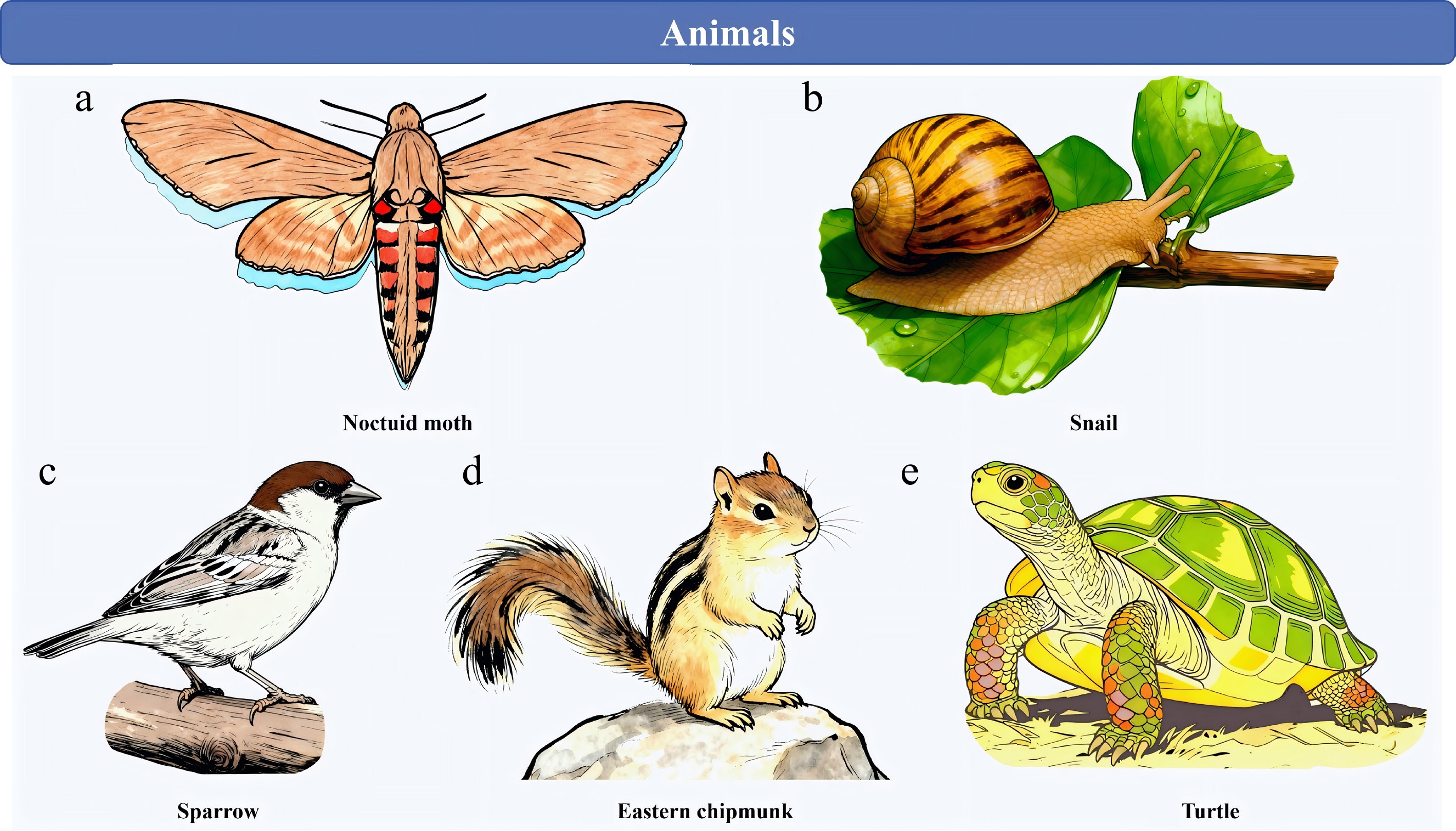 Dictyostelids rely on animal vectors for spore dispersal in many instances. (a) Noctuid moth. (b) Snail. (c) Sparrow. (d) Eastern chipmunk. (e) Turtle.