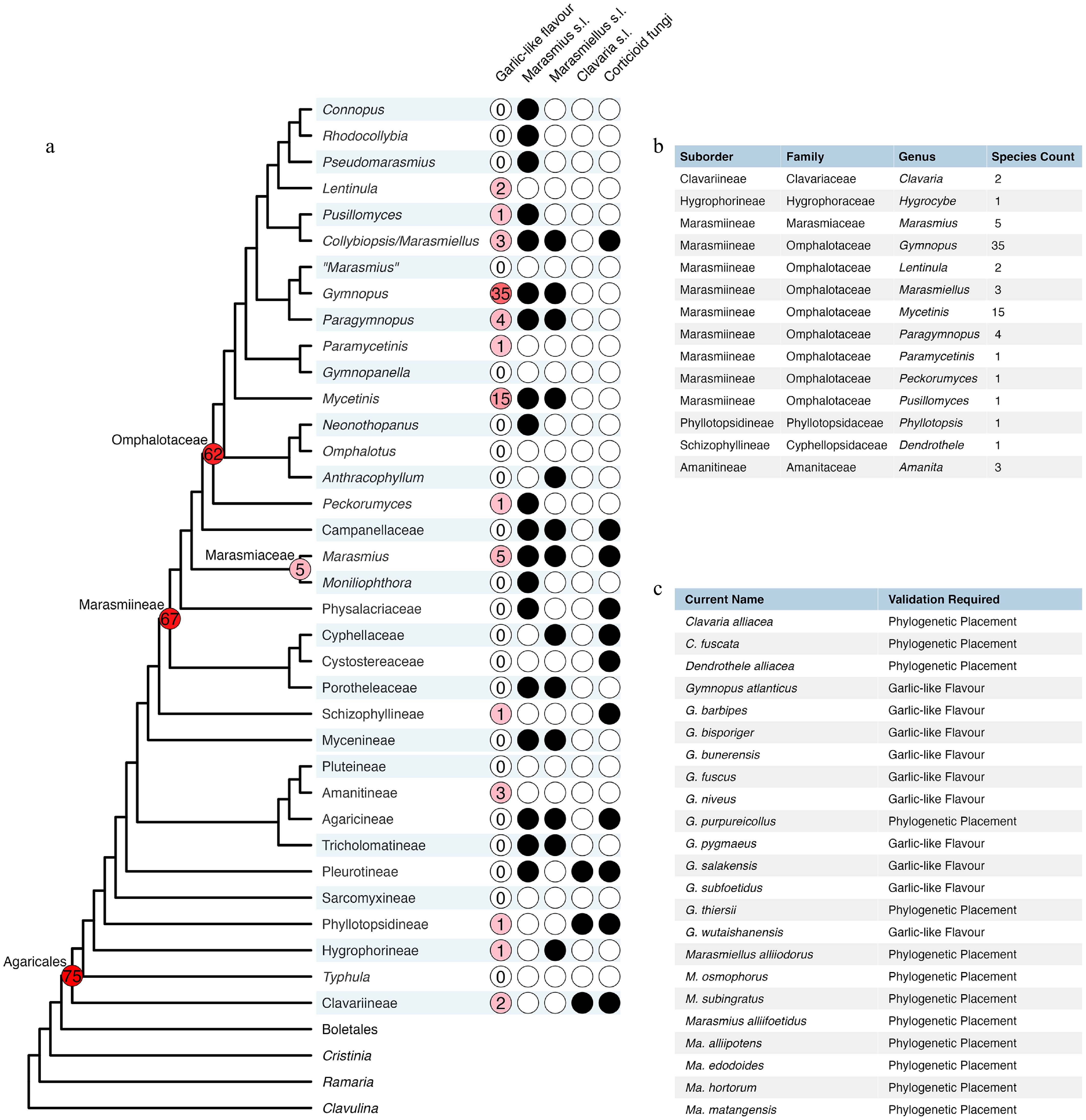 The taxonomic distribution of garlic-like flavour in the Agaricales. (a) Hybrid tree of Agaricales. Numbers inside open circles indicate the number of species with a garlic-like flavour within each taxon; red fill intensifies with increasing species counts. The "Marasmius" lineage was provisionally treated as lacking the garlic-like flavour because no verifiable records were available from literature. Black-filled circles indicate the presence of the corresponding annotation. In columns representing legacy genus concepts (Marasmius s. l., Marasmiellus s. l., and Clavaria s. l.), they mark genera containing species historically placed under those names according to Index Fungorum[50]. In the "Corticioid fungi" column, they indicate genera containing corticioid taxa as documented in Larsson[51]and Dong et al.[52]. Open circles indicate absence. (b) Summary table of taxa with a garlic-like flavour across Agaricales, listing the suborder, family, and genus, with the corresponding number of species recorded as having a garlic-like flavour. (c) List of species records requiring validation, indicating whether verification is needed for phylogenetic placement or for the presence of garlic-like flavour[7,12,33,35,53−57].