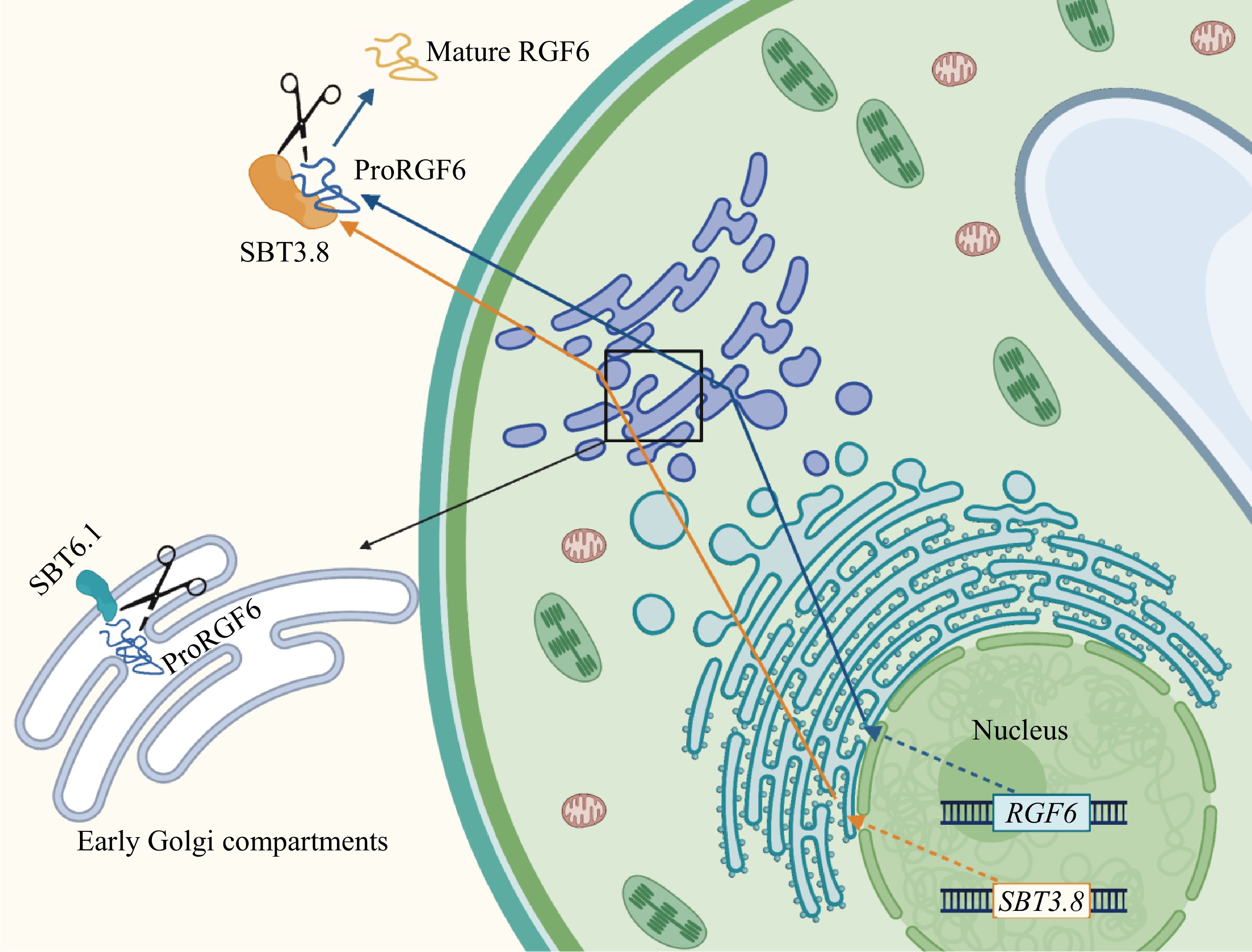 • Most SBTs in Arabidopsis are localized in the apoplast[30]. However, unlike other SBTs, AtSBT6.1 is localized at the Golgi apparatus or on the plasma membrane. Similar to its ortholog in humans, Site-1 Protease (S1P), AtSBT6.1 cleaves membrane-anchored bZIP transcription factors at the Golgi, facilitating the translocation of their cytosolic domains to the nucleus to activate expression of Endoplasmic Reticulum (ER) stress response genes[31,32]. In the study of AtSBT6.1 processing of the RGF6 precursor peptide, it was discovered that AtSBT6.1 mediated pre-processing occurs in the early Golgi compartments. Site-directed mutagenesis of the cleavage site on the RGF6 precursor impaired RGF6 precursor secretion, causing a portion of the precursor proteins to be retained at the ER and Golgi[18]. Moreover, AtSBT3.8 was shown to process unprocessed precursor proteins in vitro, suggesting that pre-processing facilitates transportation of precursor proteins out of the Golgi, enabling further processing steps (Fig. 1).