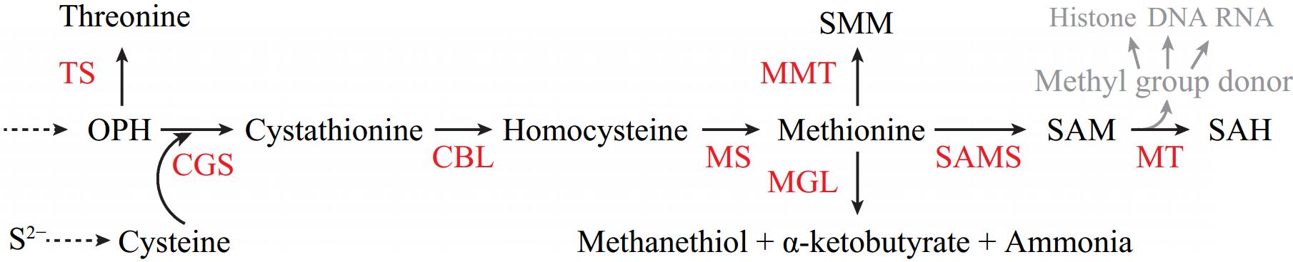 The metabolism and homeostasis of methionine and S-adenosyl-methionine (SAM) in plants. Methionine can be de novo synthesized from O-phosphohomoserine (OPH), in which cystathionine γ-synthase (CGS) competes with threonine synthase (TS) for OPH. CGS metabolizes OPH and cysteine to cystathionine which is then converted to homocysteine by cystathionine β-lyase (CBL). Methionine is produced from homocysteine by methionine synthase (MS). Methionine can be metabolized to methanethiol, α-ketobutyrate and ammonia by methionine γ-lyase (MGL). It also can be converted to S-methylmethionine (SMM) by methionine S-methyltransferase (MMT). The conversion of SAM to S-adenosylhomocysteine (SAH) by diverse methyltransferases (MTs) provides methyl moiety for acceptors including histone, DNA, and RNA.