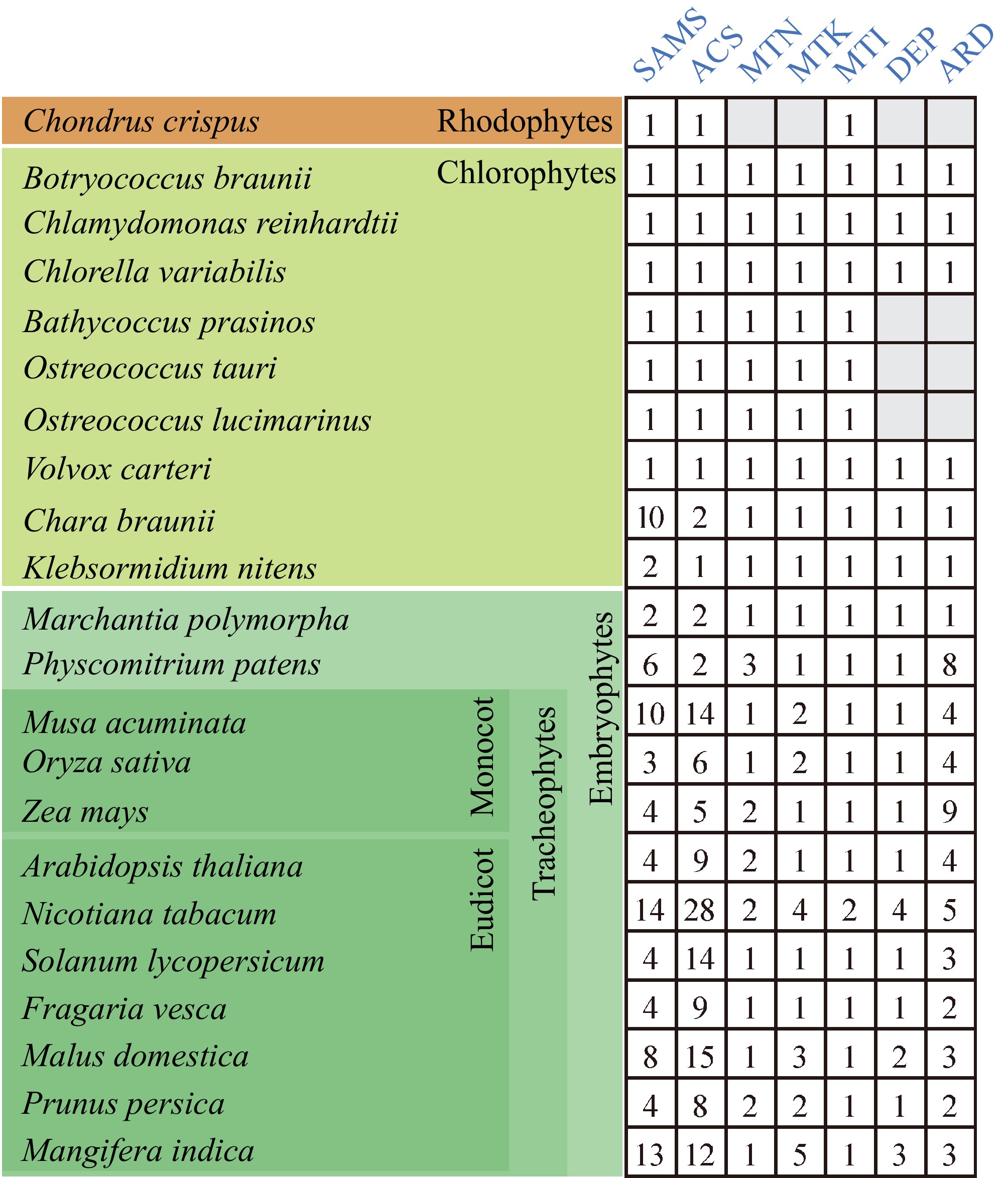 The enzyme proteins of the Yang cycle in several major plant lineages. The Yang cycle proteins in each species were identified using BLAST with an E-value threshold of 1e−5, employing the default settings of TBtools-II. Searches were conducted with the amino acid sequences of each enzyme from Arabidopsis thaliana as references. The numbers indicate enzyme paralogs. Gray boxes indicate an absence of enzyme paralog.