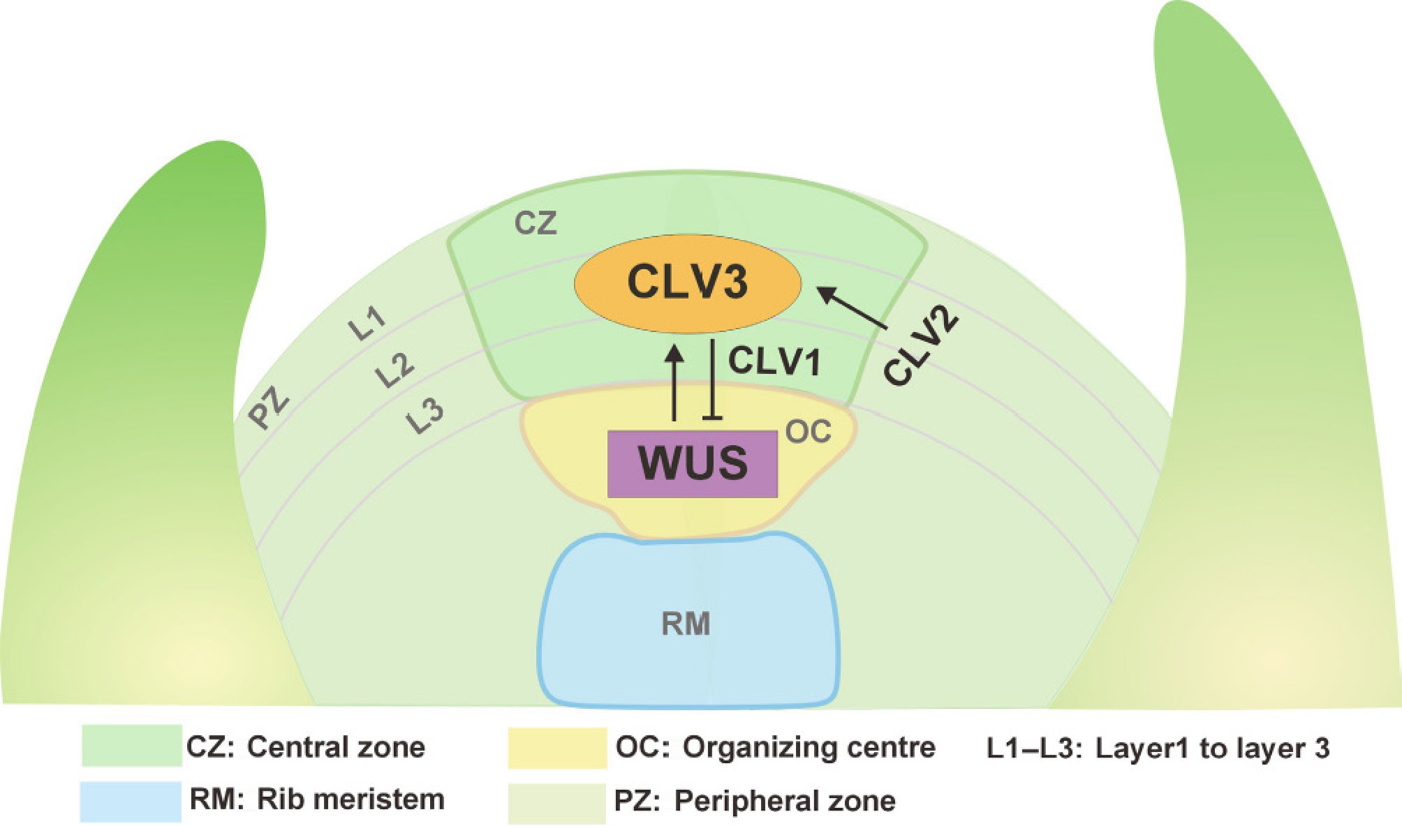 The CLAVATA3-WUSCHEL negative feedback loop in the shoot meristem. The SAM is composed of three cell layers (L1−L3) and can be divided into distinct functional domains based on its functional and cytological characteristics. These domains include the central zone (CZ), peripheral zone (PZ), organizing center (OC), and rib meristem (RM). The transcription factor WUS is specifically expressed in the OC. Its expression is suppressed by a signaling cascade involving the small peptide CLV3, which binds to the transmembrane receptor kinase CLV1, and the receptor-like protein CLV2. Under normal conditions, the WUS protein moves from the OC to the CZ, where it activates CLV3 expression to inhibit its own activity, thereby ensuring proper growth volume in the plant. Consequently, these components form a feedback loop within the SAM that balances stem cell maintenance and cell differentiation.