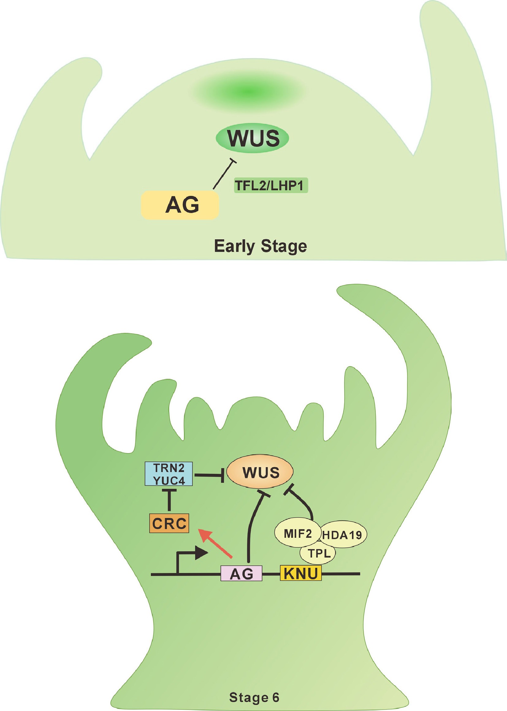 AGAMOUS-WUSCHEL signaling in the flower meristem. During the early stages of floral development, AG directly represses the WUS gene by recruiting the Polycomb Group (PcG) protein TFL2/LHP1 in the initial phase of floral meristem (FM) termination, thereby terminating floral stem cell fate. At stage 6 of floral development, AG activates the expression of CRC and KNU, which indirectly suppress WUS, ensuring FM determinacy.