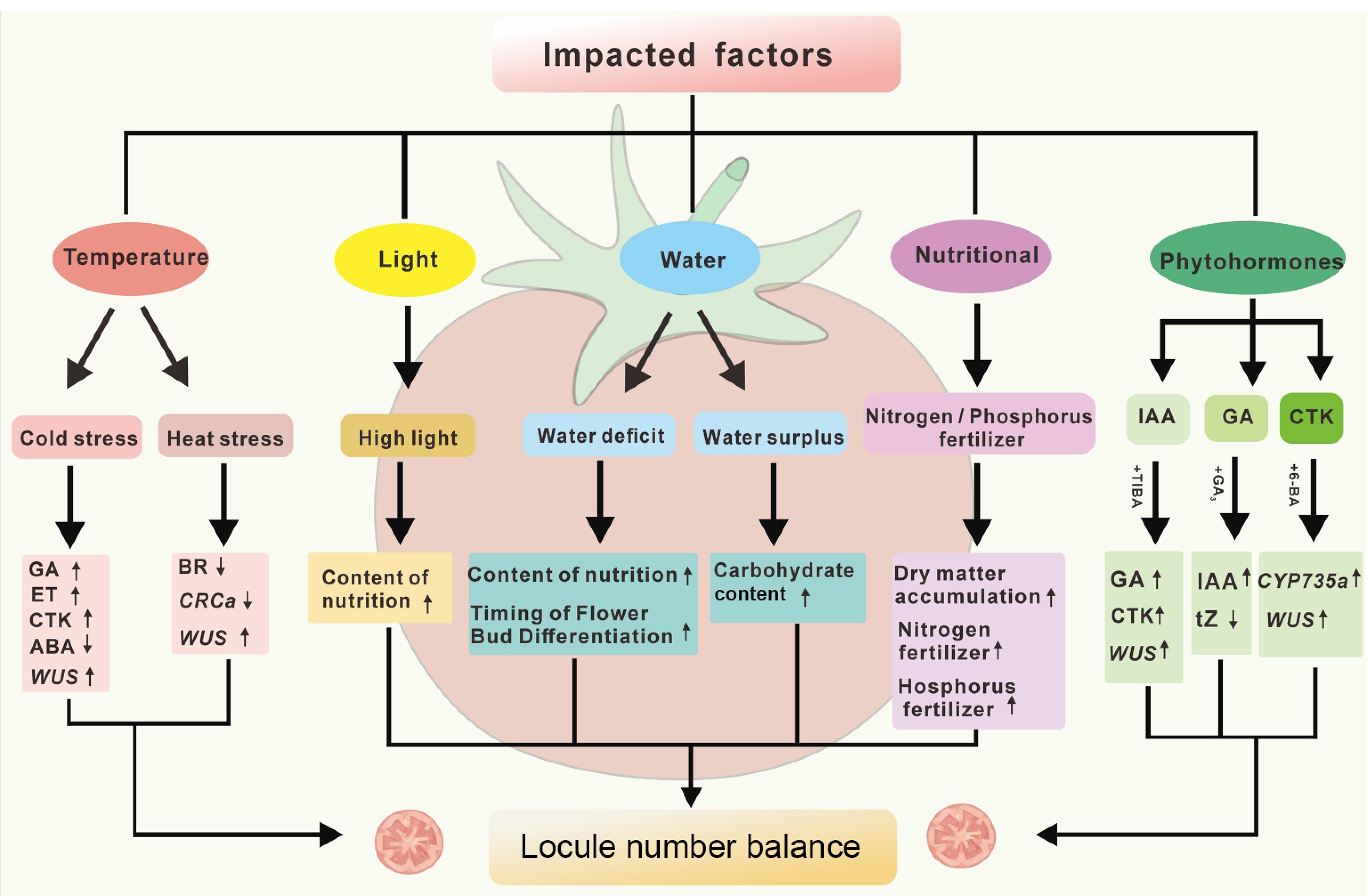 Critical factors in abnormal fruit development. This diagram summarizes the key factors influencing tomato malformed fruit formation (temperature, light, water, nutrients, and phytohormones), which lead to changes in the levels of GA (gibberellins), CK (cytokinins), ET (ethylene), ABA (abscisic acid), tZ (trans-zeatin), WUS (wuschel), and CRCa (CRABS CLAWa). The upward and downward arrows indicate the increase or decrease of hormone levels, gene expression, or physiological indicators under specific conditions.