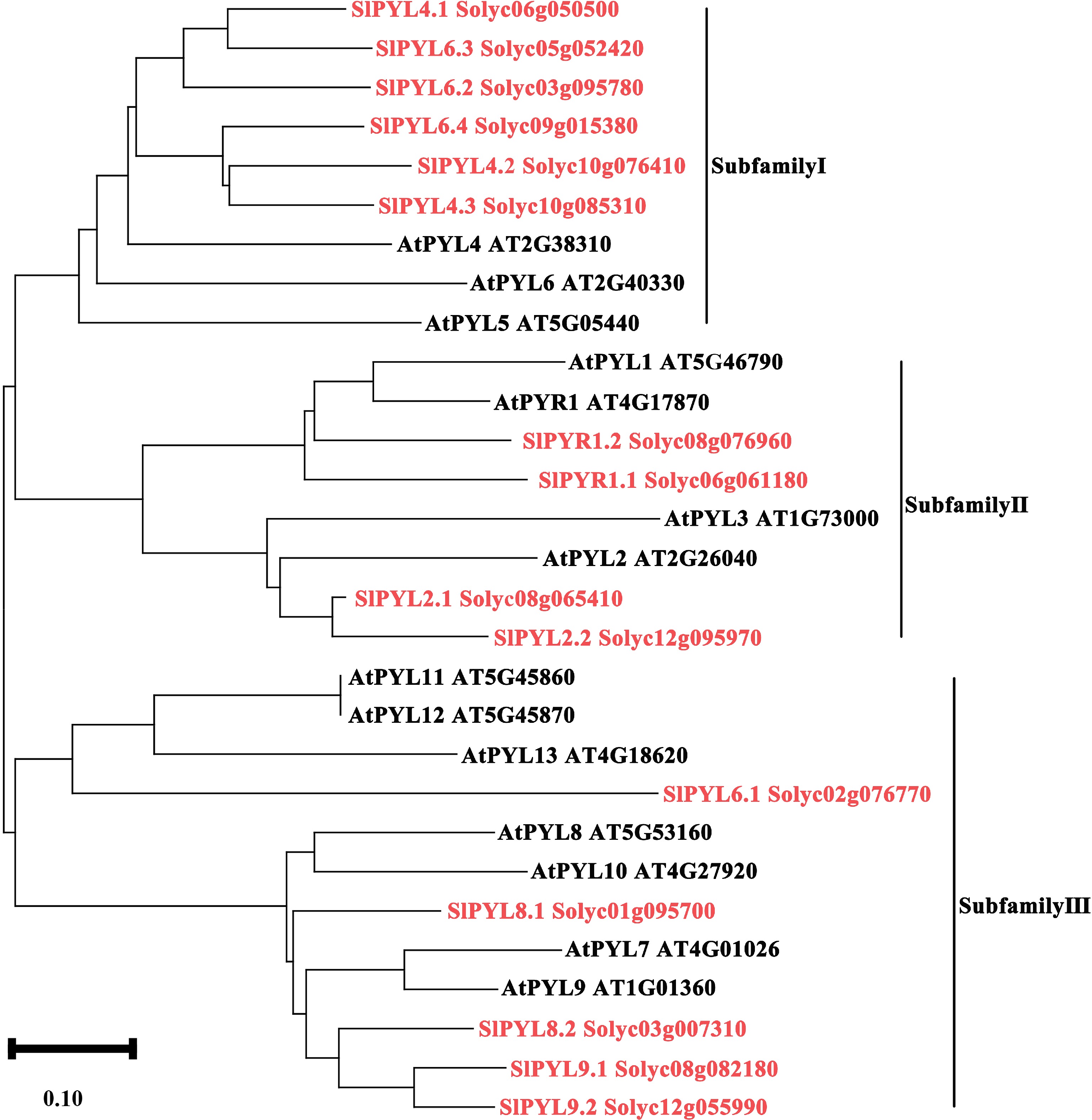 • Based on the transcriptome data in our previous study[19], 15 PYR/PYL/RCAR family members were screened. The sequences of nucleotides and amino acids were obtained from version SL4.0 of the tomato genome (Supplementary Table S2). To avoid duplicate names, 15 SlPYR/PYLs were renamed according to the gene descriptions in the tomato genome. Based on the phylogenetic analysis, the SlPYR/PYL genes were divided into three subfamilies (Fig. 1). Subfamily I harbors the largest family members, including SlPYL4.1, SlPYL4.2, SlPYL4.3, SlPYL6.2, SlPYL6.3, and SlPYL6.4, which showed very close homology to Arabidopsis PYL4/PYL5/PYL6. Subfamily II harbors four SlPYR/PYLs, where SlPYR1.1 and SlPYR1.2 exhibited high amino acid homology with AtPYR1 and AtPYL1, while SlPYL2.1 and SlPYL2.2 displayed strong sequence homology with AtPYL2 and AtPYL3. In subfamily III, SlPYL8.1 shared close homology with AtPYL8 and AtPYL10, while three SlPYR/PYLs, including SlPYL8.2, SlPYL9.1, and SlPYL9.2, had close homology with AtPYL7 and AtPYL9. Additionally, SlPYL6.1 was found to be more closely related to AtPYL11/AtPYL12/AtPYL13 (Fig. 1).