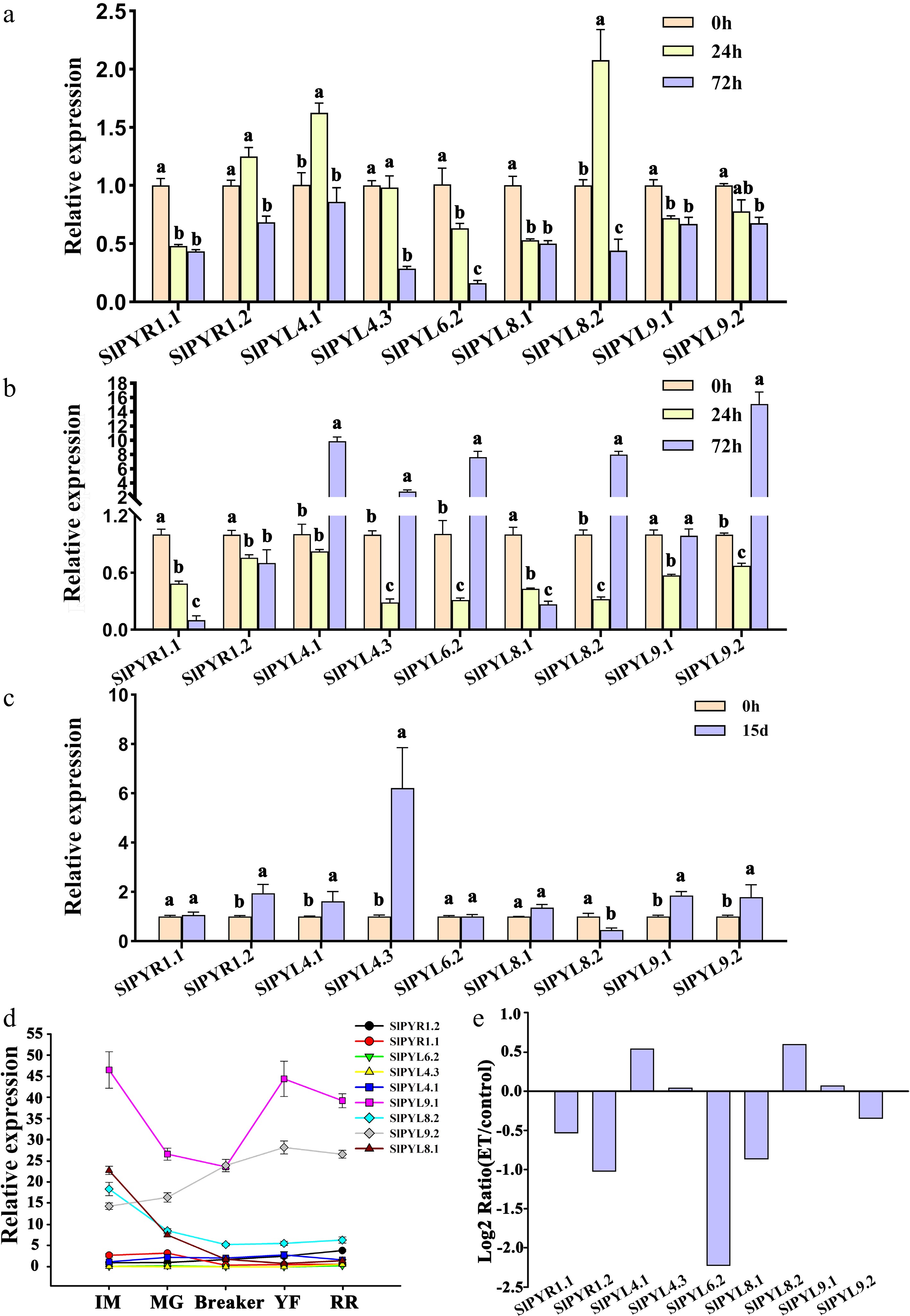 Expression profiling of SlPYR/PYL genes responding to phytohormonal treatments and abiotic stresses in tomato determined by qRT-PCR. Expression patterns of SlPYR/PYLs at 0, 24, and 72 h after (a) ABA treatment, and (b) salt stress. (c) Expression of SlPYR/PYLs following 15-d progressive drought stress. (d) Expression of SlPYR/PYLs at different developmental stages during fruit maturation. IM, immature green (15 DPA). MG, mature green (35 DPA). BR, breaker (39 DPA). RR, red ripe (45 DPA). (e) Expression of SlPYR/PYLs in tomato fruit in response to exogenous ethylene (ET) application for 72 h. Data represents mean ± SEM of three biological replicates. Different lowercase letters indicate statistically significant differences (p < 0.05) between experimental groups.