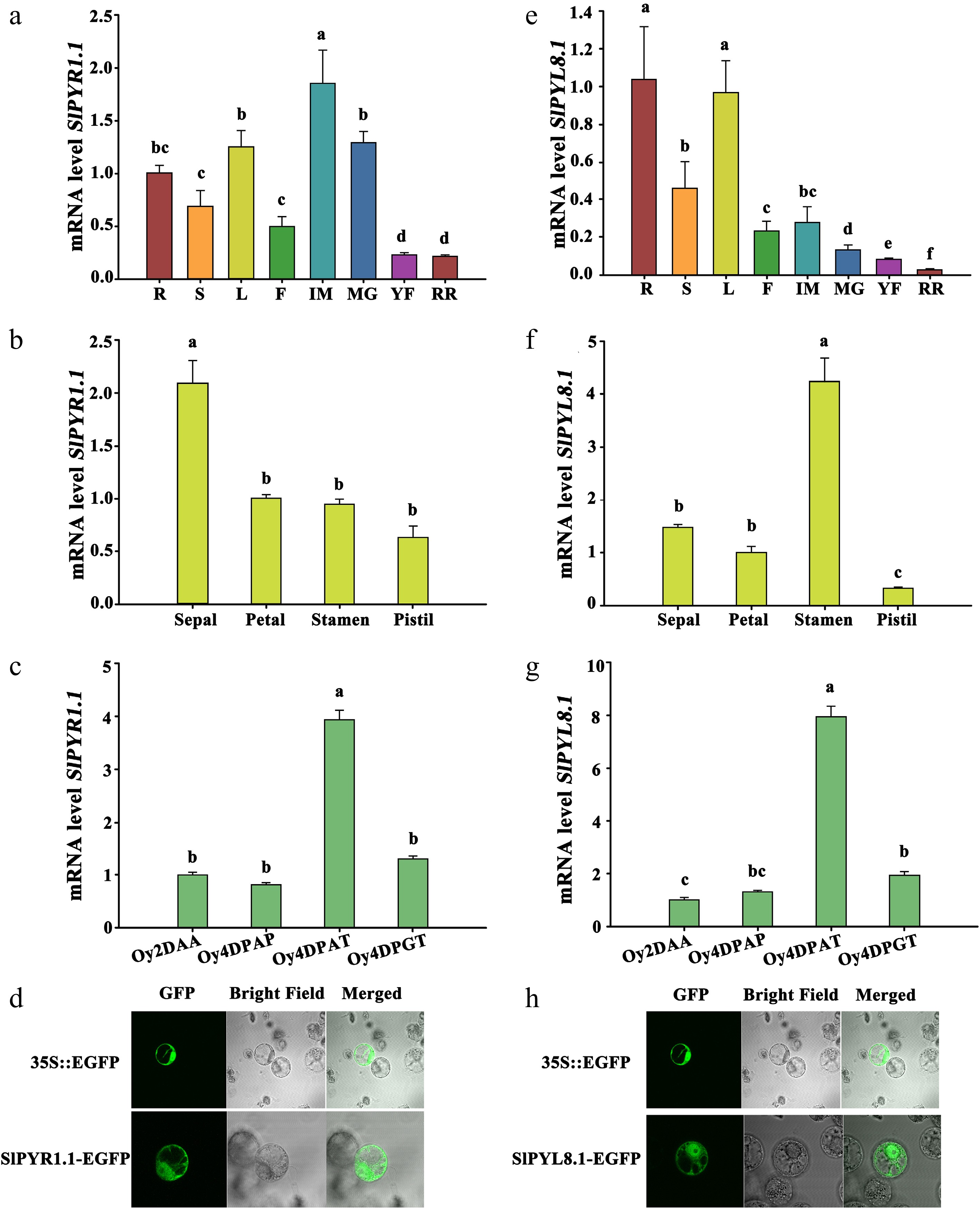 Spatiotemporal expression and subcellular localization of SlPYR1.1 and SlPYL8.1. Expression patterns of (a) SlPYR1.1, and (e) SlPYL8.1 in various tissues/organs determined by qRT-PCR. R, S, L, F, IM, MG, YF, and RR indicate root, shoot, leaf, flower, and fruit at immature, mature green, yellow ripe, and red ripe stages, respectively. Expression profiles of (b) SlPYR1.1, and (f) SlPYL8.1 in four-whorled floral organs. Expressions of (c) SlPYR1.1, and (g) SlPYL8.1 in the ovaries at 2 d before anthesis (2 DAA), 4 d after pollination (4 DPAP), 2,4-dichlorophenoxyaceticacid (2,4-D) (4 DPAT), and GA3 application (4 DPGT). Data represents mean ± SEM of three biological replicates. Different lowercase letters indicate statistically significant differences (p < 0.05) between experimental groups. Subcellular localization of (d) SlPYR1.1, and (g) SlPYL8.1.
