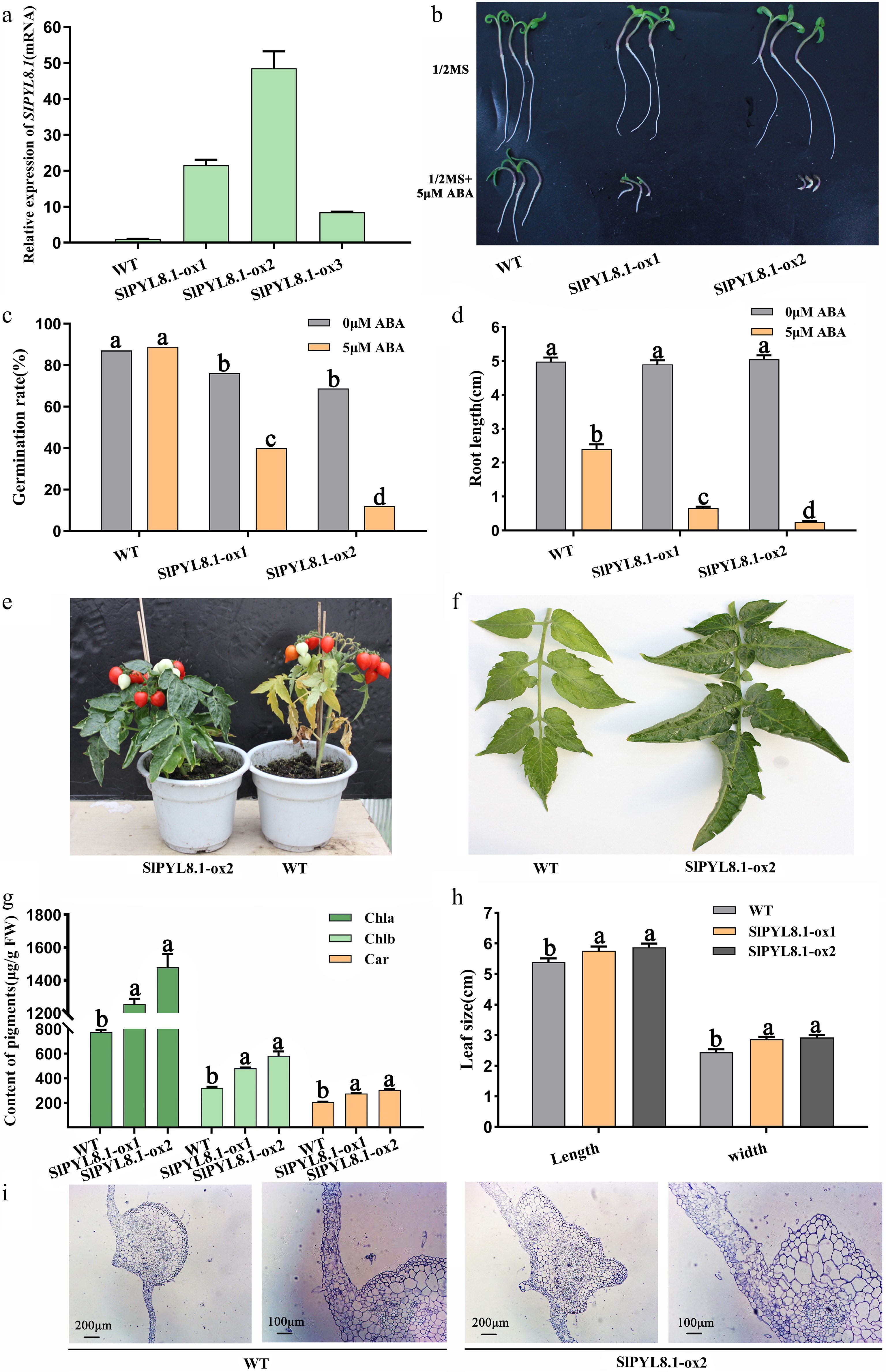 Overexpression of SlPYL8.1 led to ABA hypersensitivity and delayed plant senescence. (a) The relative mRNA level of SlPYL8.1 in three independent overexpression lines. (b) The seed germination and root growth of WT and SlPYL8.1-OX tomatoes on medium supplemented with ABA. (c) Seed germination rate of WT and SlPYL8.1-OX tomatoes under ABA treatment. (d) Root length of WT and SlPYL8.1-OX lines under ABA treatment. (e) Overexpression of SlPYL8.1 led to delayed plant senescence. (f) Leaf architecture of WT and SlPYL8.1 overexpressing plants. (g) Pigment contents in WT and SlPYL8.1 overexpressing tomatoes. (h) Leaf size of WT and SlPYL8.1-OX plants. (i) Transverse leaf section showing the mesophyll cells and vascular bundle organization. Data represents mean ± SEM of at least three biological replicates. Different lowercase letters indicate statistically significant differences (p < 0.05, one-way ANOVA with Tukey's HSD) among experimental groups.
