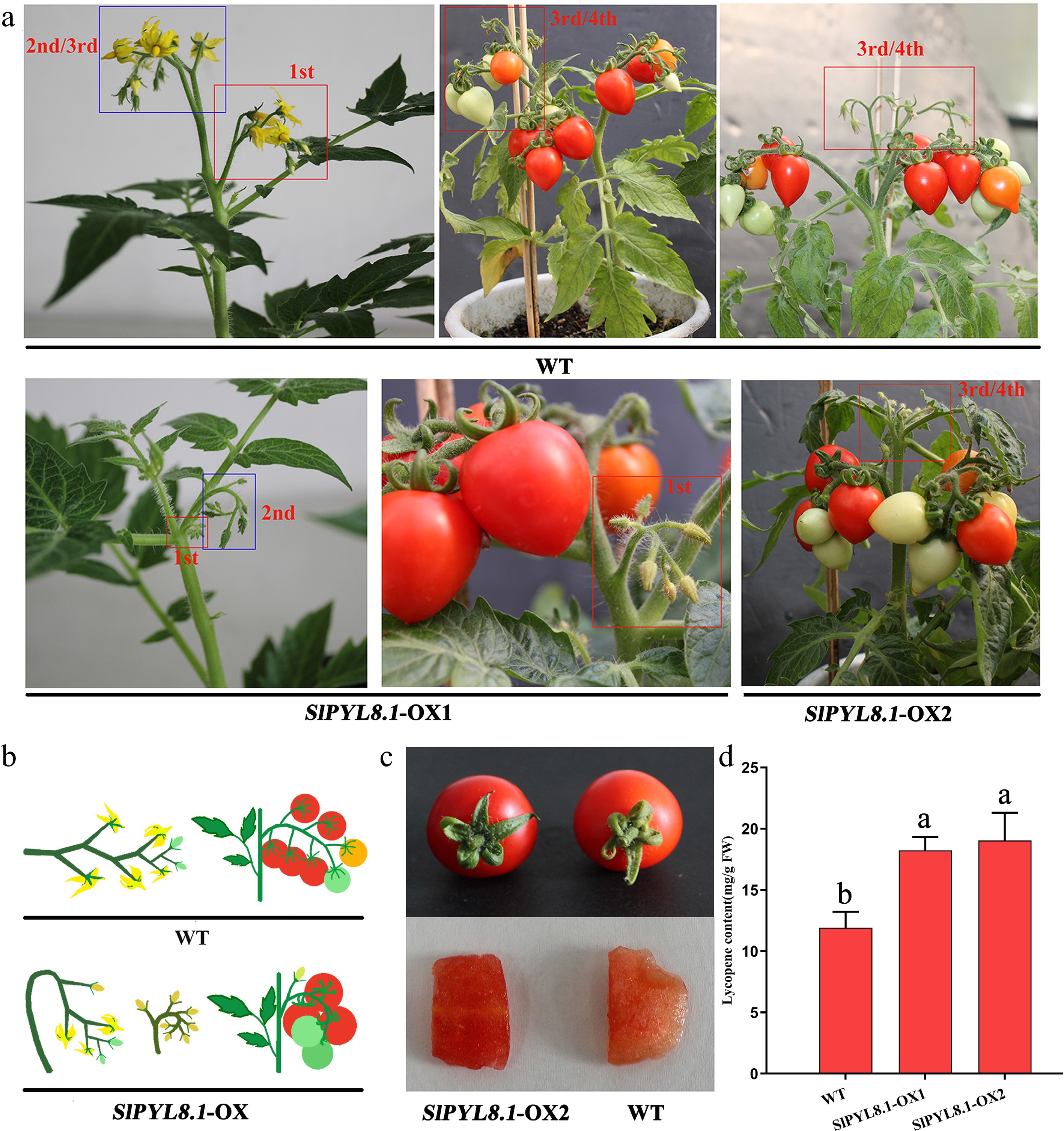 SlPYL8.1 overexpression modified inflorescence architecture and altered fruit pigmentation. (a) SlPYL8.1 overexpression led to flower bud abortion. (b) Schematic diagram of inflorescence structures of WT and transgenic plants. (c) SlPYL8.1 overexpression resulted in alterations in fruit flesh color. (d) Lycopene content of WT and SlPYL8.1-OX plants. Data represents mean ± SEM of at least three biological replicates. Different lowercase letters indicate statistically significant differences (p < 0.05, one-way ANOVA with Tukey's HSD) among experimental groups.