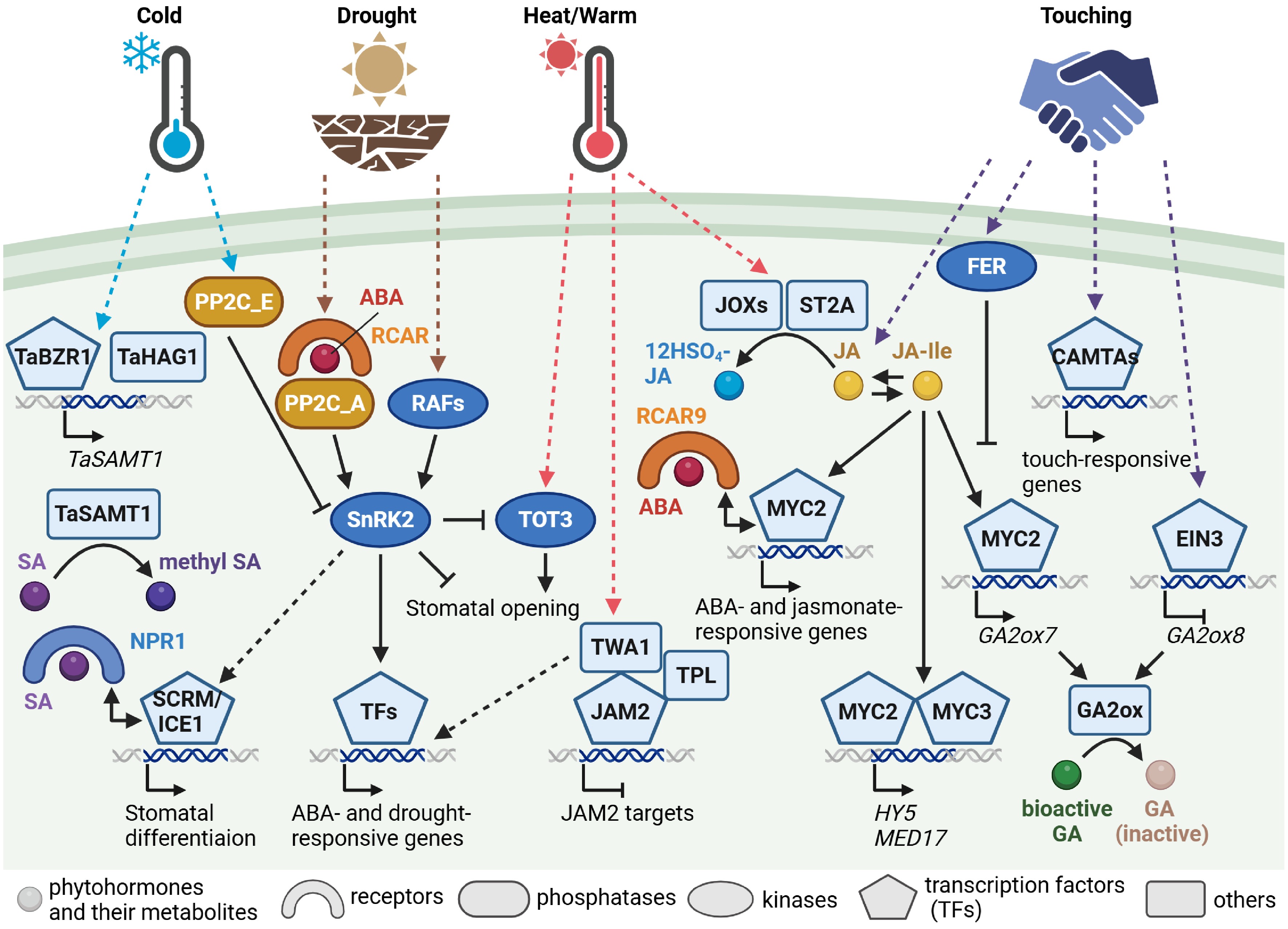 Abiotic stress signaling associated with abscisic acid, jasmonate, and salicylic acid signaling and metabolism. Simplified signaling pathways from phytohormone perception to transcriptional regulation of abscisic acid (ABA), jasmonate, and salicylic acid (SA) in response to drought, heat, or warm temperature, cold, and touching stresses. Key signaling components are illustrated using different shapes, as indicated. Arrows represent activation, T-shaped lines indicate inhibition, and dashed lines denote proposed or indirect pathways. 12HSO4-JA, 12-hydroxy jasmonoyl sulfate; BZR1, BRASSINAZOLE-RESISTANT 1; CAMTA, calmodulin-binding transcription activator; EIN3, ETHYLENE-INSENSITIVE 3; FER, FERONIA; GA, gibberellin; GA2ox, GA 2-oxidase; HAG1, HISTONE ACETYLTRANSFERASE OF THE GNAT FAMILY 1; ICE1, INDUCER OF CBF EXPRESSION 1; JA, jasmonic acid; JA-Ile, jasmonoyl-isoleucine; JAM2, JASMONATE-ASSOCIATED MYC2-LIKE 2; JOX, JASMONATE-INDUCED OXYGENASE; MED17, MEDIATOR SUBUNIT 17; NPR1, NONEXPRESSOR OF PATHOGENESIS-RELATED GENES 1; PP2C_A, clade A protein phosphatases of type 2C (PP2C); PP2C_E, clade E PP2C; RAF, Raf-like MAP kinase kinase kinase; RCAR, REGULATORY COMPONENTS OF ABA RECEPTOR; SAMT1, SA METHYLTRANSFERASE 1; SCRM, SCREAM; SnRK2, sucrose non-fermenting-1 (SNF1)-related protein kinase 2; ST2A, SULFOTRANSFERASE 2A; TOT3, TARGET OF TEMPERATURE 3; TPL, TOPLESS; TWA1, THERMO-WITH ABA-RESPONSE 1. Created with BioRender.com.