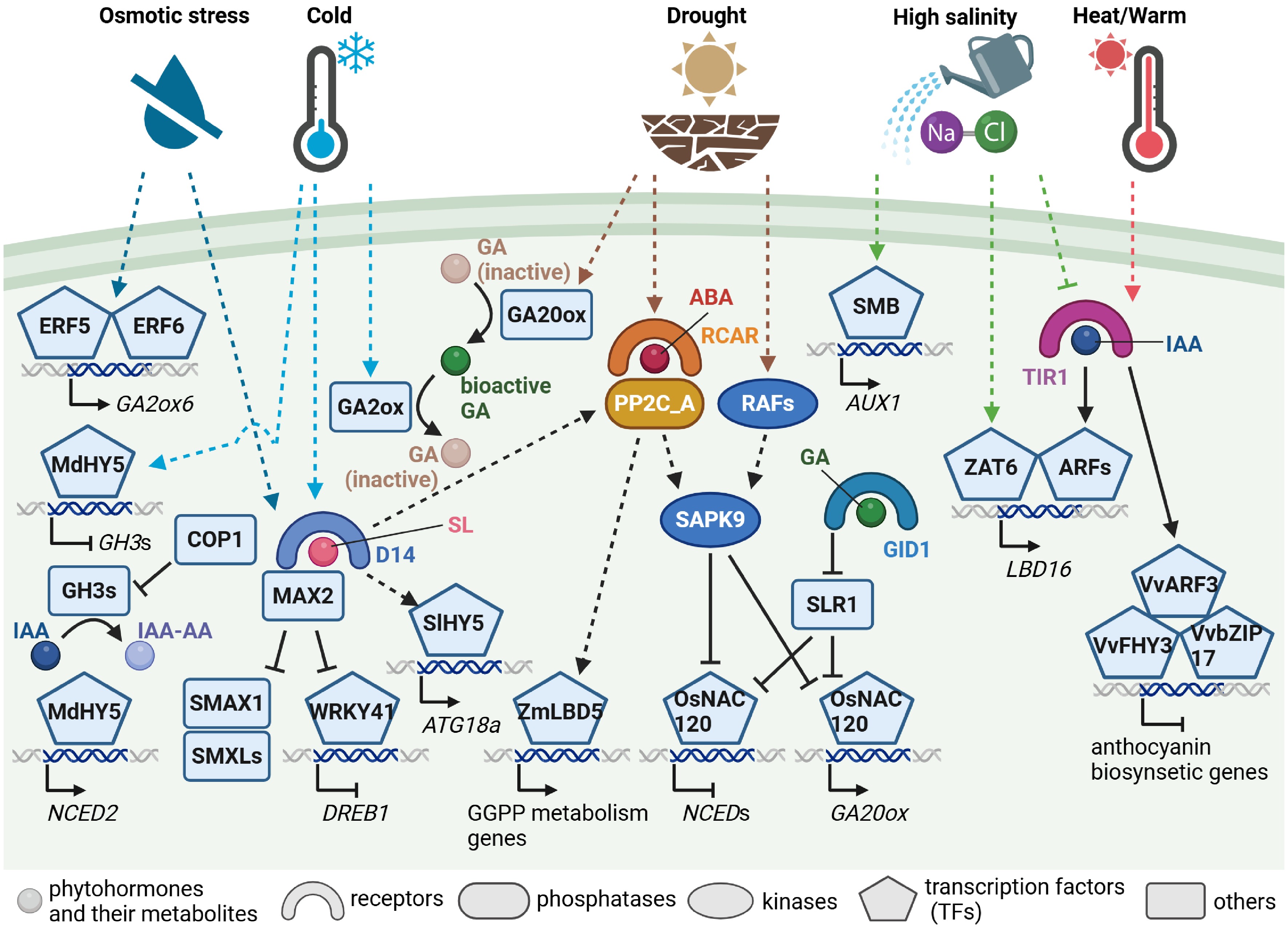 Abiotic stress signaling associated with gibberellin, auxin, and strigolactone signaling and metabolism. Simplified signaling pathways from phytohormone perception to transcriptional regulation of gibberellin (GA), auxin (indole-3-acetic acid [IAA]), and strigolactone (SL) in response to drought, osmotic, high-salinity, heat or warm temperature, and cold stresses. Key signaling components are illustrated using different shapes, as indicated. Arrows represent activation, T-shaped lines indicate inhibition, and dashed lines denote proposed or indirect pathways. ABA, abscisic acid; ARF, AUXIN RESPONSE FACTOR; ATG18a, AUTOPHAGY-RELATED GENE 18a; COP1, CONSTITUTIVELY PHOTOMORPHOGENIC 1; D14, DWARF14; DREB1, DRE-BINDING PROTEIN 1; ERF, ETHYLENE RESPONSE FACTOR; FHY3, FAR-RED ELONGATED HYPOCOTYL 3; GA2ox, GA 2-oxidase; GA20ox, GA 20-oxidase; GGPP, geranylgeranyl diphosphate; GH3, GRETCHEN HAGEN 3; GID1, GIBBERELLIN INSENSITIVE DWARF 1; IAA-AA, IAA-amino acid conjugate; LBD, LATERAL ORGAN BOUNDARIES DOMAIN; MAX2, MORE AXILLARY GROWTH 2; NCED, NINE-CISEPOXYCAROTENOID DIOXYGENASE; PP2C_A, clade A protein phosphatases of type 2C (PP2C); RAF, Raf-like MAP kinase kinase kinase; RCAR, REGULATORY COMPONENTS OF ABA RECEPTOR; SAPK9, OSMOTIC STRESS/ABA–ACTIVATED PROTEIN KINASE 9; SLR1, SLENDER RICE 1; SMAX1, SUPPRESSOR OF MAX2 1; SMB, SOMBRERO; SMXL, SMAX1-LIKE; TIR1, TRANSPORT INHIBITOR RESPONSE 1; ZAT6, ZINC FINGER OF ARABIDOPSIS THALIANA 6 (created with BioRender.com).