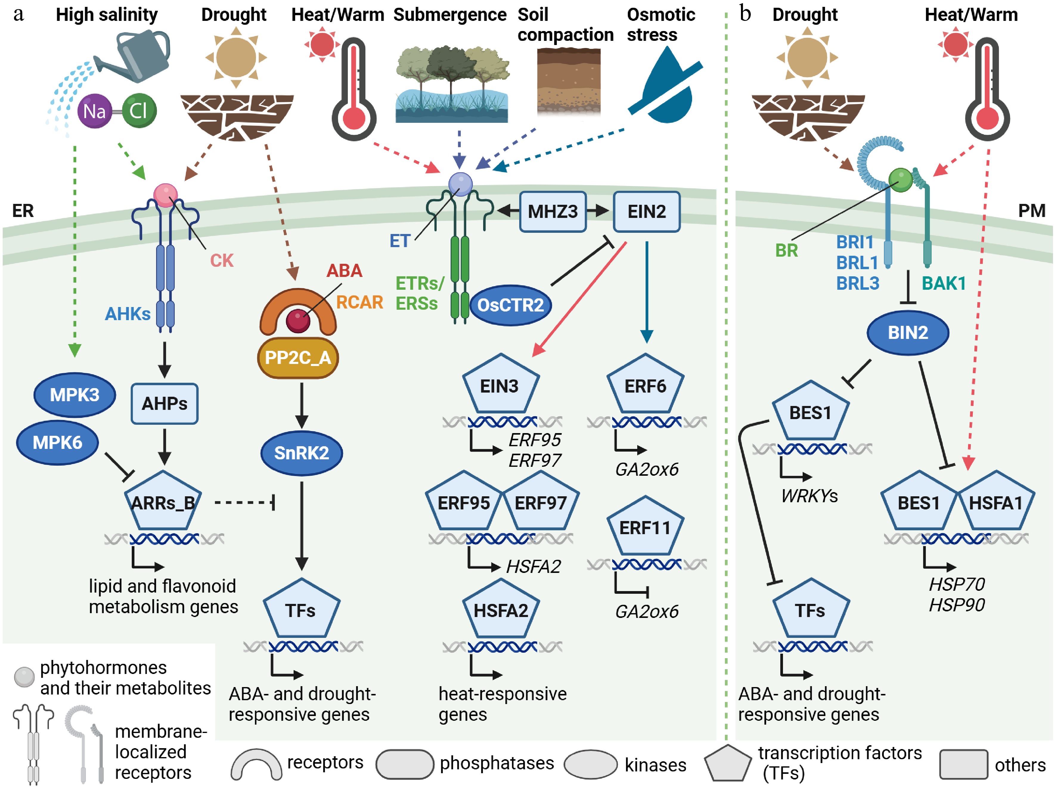Abiotic stress signaling associated with cytokinin, ethylene, and brassinosteroid signaling and metabolism. Simplified signaling pathways from phytohormone perception to transcriptional regulation of cytokinin (CK), ethylene (ET), and brassinosteroid (BR) in response to drought, osmotic, high-salinity, heat or warm temperature, submergence, and soil compaction stresses. Given that the major receptor proteins for CK and ET are localized to the endoplasmic reticulum (ER) membrane (a), whilst those for BR are localized to the plasma membrane (PM) (b), the pathways are illustrated separately for clarity. Key signaling components are illustrated using different shapes, as indicated. Arrows represent activation, T-shaped lines indicate inhibition, and dashed lines denote proposed or indirect pathways. ABA, abscisic acid; AHK, ARABIDOPSIS HISTIDINE KINASE; AHP, ARABIDOPSIS HISTIDINE-CONTAINING PHOSPHOTRANSFER PROTEIN; ARRs_B, type-B ARABIDOPSIS RESPONSE REGULATOR; BAK1, BRASSINOSTEROID-INSENSITIVE 1(BRI1)-ASSOCIATED RECEPTOR KINASE 1; BIN2, BRASSINOSTEROID-INSENSITIVE 2; BRL, BRI1-LIKE; BES1, BRI1-EMS-SUPPRESSOR 1; CTR, CONSTITUTIVE TRIPLE RESPONSE; EIN, ETHYLENE-INSENSITIVE; ERF, ETHYLENE RESPONSE FACTOR; ERS, ETHYLENE RESPONSE SENSOR; ETR, ETHYLENE RESPONSE; GA, gibberellin; GA2ox, GA 2-oxidase; HSFA, HEAT SHOCK TRANSCRIPTION FACTOR A; HSP, HEAT SHOCK PROTEIN; MHZ3, MAO HUZI 3; MPK, MAP kinase; PP2C_A, clade A protein phosphatases of type 2C (PP2C); RCAR, REGULATORY COMPONENTS OF ABA RECEPTOR; SnRK2, sucrose non-fermenting-1 (SNF1)-related protein kinase 2 (created with BioRender.com).