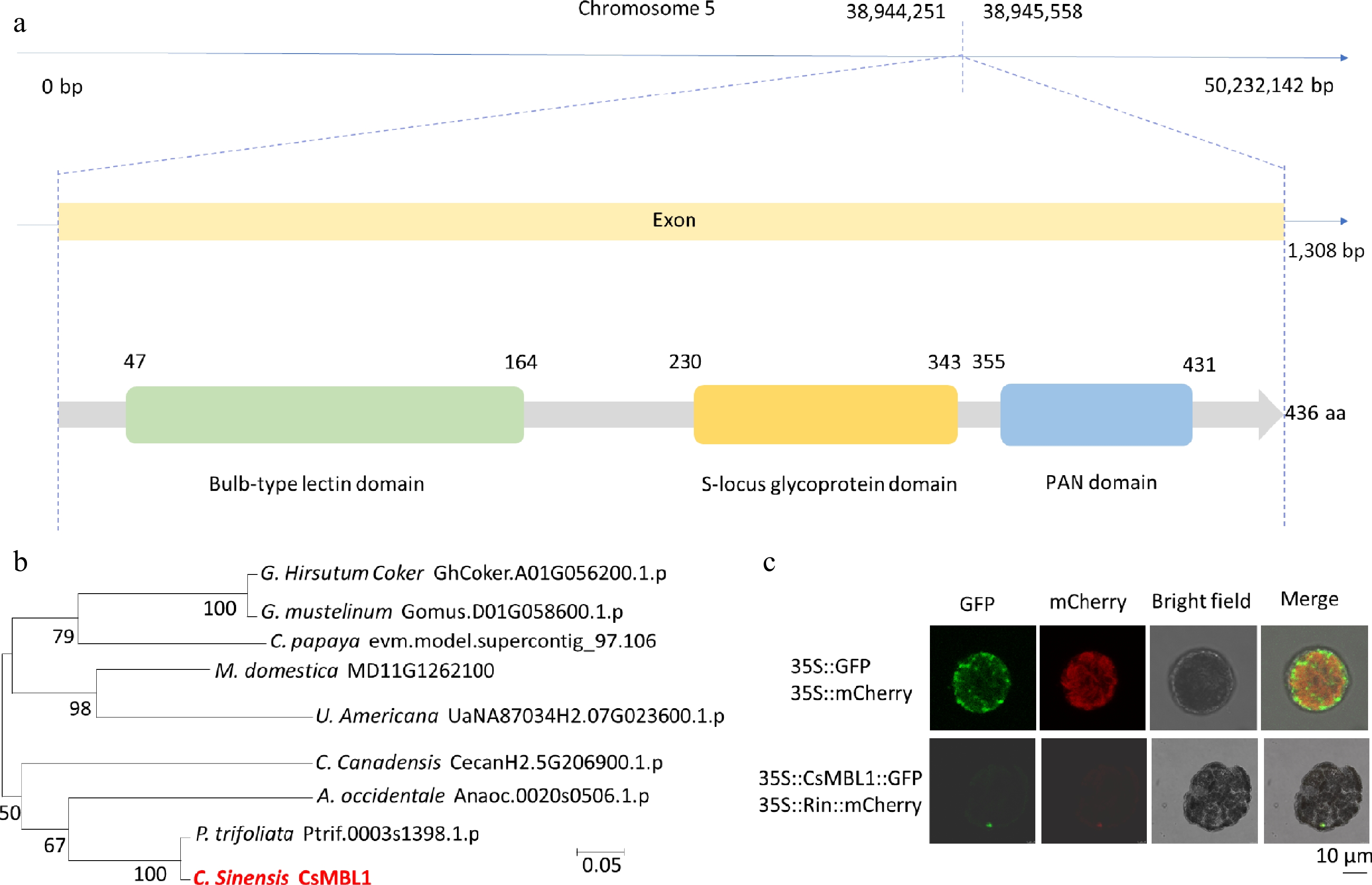 • CsMBL1 is present on chromosome 5 of sweet orange, and encodes a protein comprising 436 amino acids, with Bulb-type lectin, S-locus glycoprotein, and PAN domains. The CsMBL1 gene is 1,308 bp long and comprises a single exon (Fig. 1a). Phylogenetic analysis revealed that CsMBL1 is significantly associated with Poncirus trifoliata Ptrif.0003s1398.1.p. (Fig. 1b). The subcellular localization analysis revealed that CsMBL1 is primarily located in the nucleus (Fig. 1c).