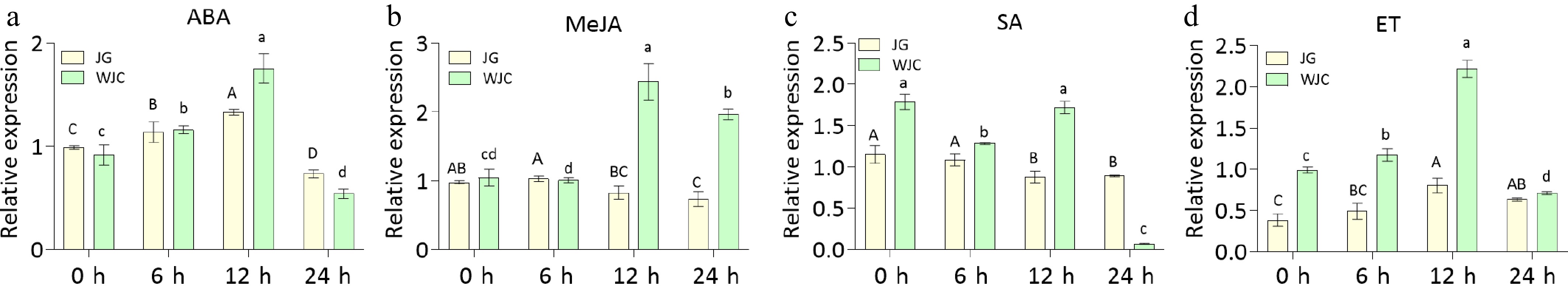 Effects of phytohormone treatments on CsMBL1 expression in plants. qRT-PCR analysis of CsMBL1 expression in kumquat and Wanjincheng leaves following treatments with (a) ABA, (b) MeJA, (c) SA, (d) ET, and H2O (control). CsGAPDH (CPDB ID: Cs_ont_5g044290) was used as the internal reference gene. Statistical comparisons were performed using ANOVA with Duncan's multiple range test. WJC: Wanjincheng; JG: Kumquat.