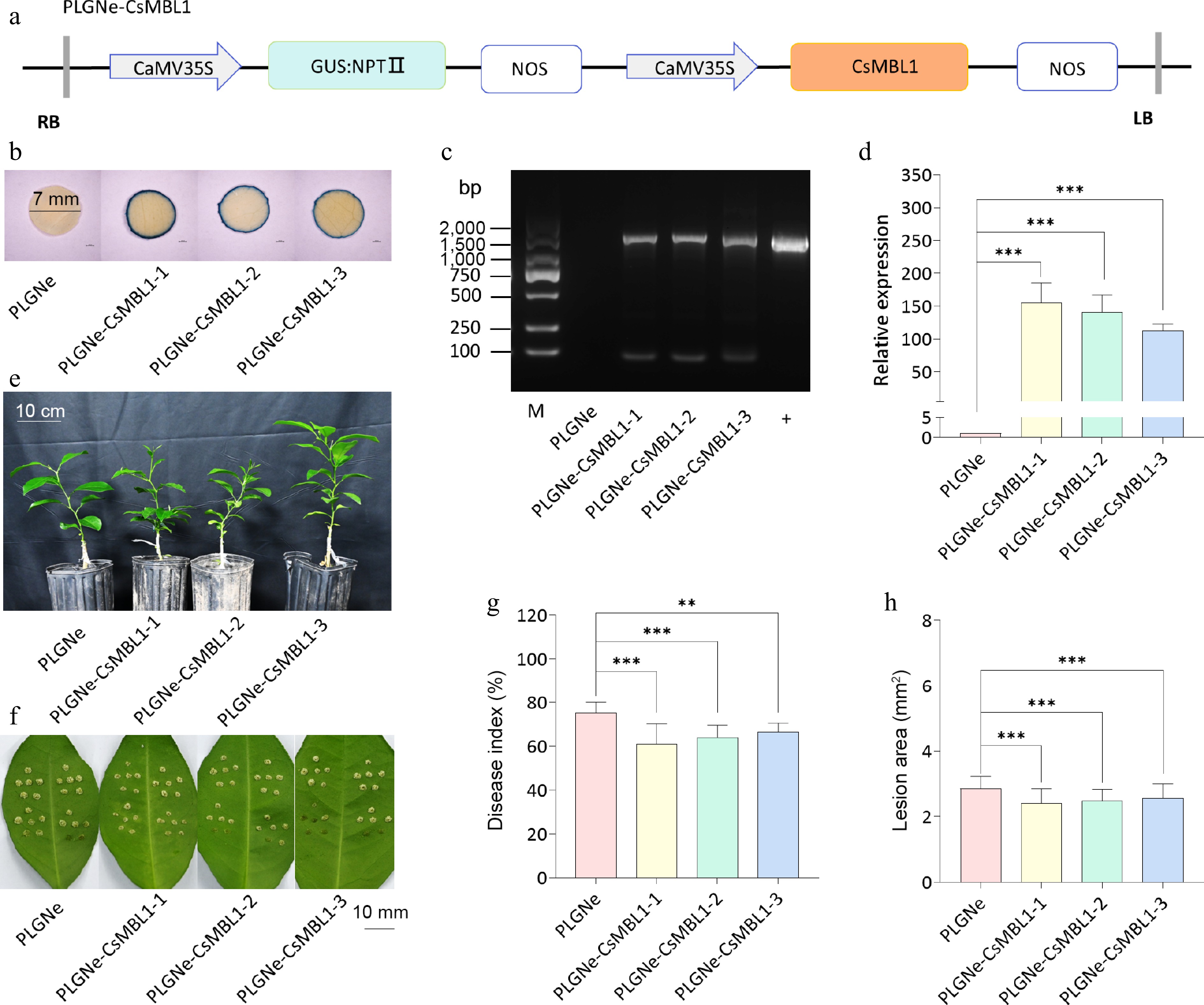 • In this study, a CsMBL1 overexpression plasmid was designed to assess its effects (Fig. 3a). The GUS staining indicated blue color on the leaf disc edge in three transgenic plants (PLGNe-CsMBL1-1, -2, -3), while no staining was observed in control plants (PLGNe) (Fig. 3b). PCR analysis detected the target fragment in the transgenic and positive control samples, but not in the control samples (Fig. 3c). Furthermore, qRT-PCR analysis validated CsMBL1 overexpression in transgenic plants (Fig. 3d). Moreover, transgenic plants had normal growth rates (Fig. 3e), and reduced citrus canker symptoms compared to controls (Fig. 3f). Similarly, the lesion disease and area index were reduced by 11.5%−18.8% and 10.6%−15.4%, respectively (Fig. 3g and h). These data revealed that CsMBL1 overexpression increases citrus canker resistance.