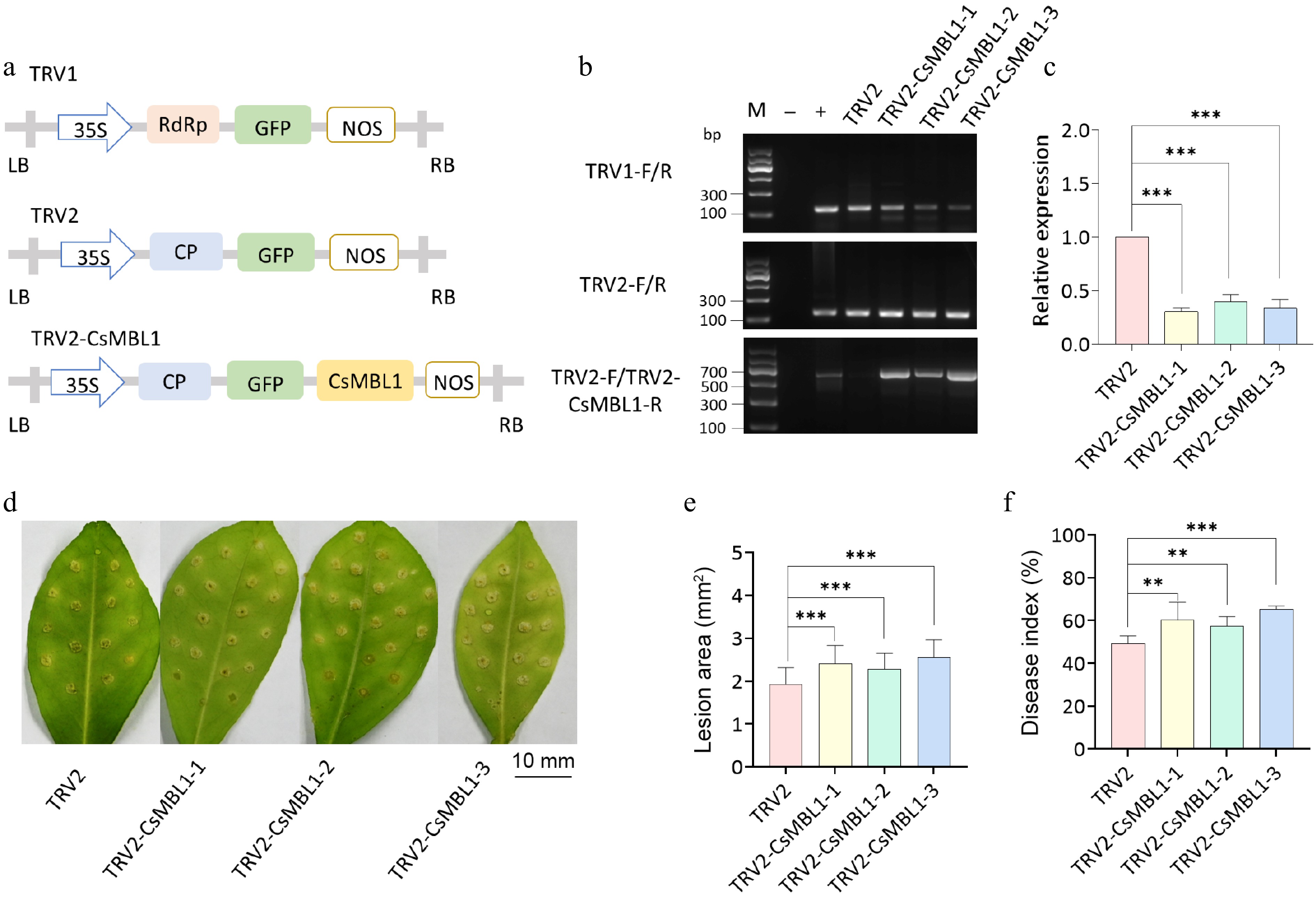 • To evaluate the role of CsMBL1 in citrus canker resistance, CsMBL1 was silenced in Wanjincheng plants. A CsMBL1 VIGS plasmid was constructed using the TRV2 vector (Fig. 4a). Furthermore, CsMBL1 silencing in VIGS plants was validated by PCR analysis using TRV1 and TRV2-specific primers (Fig. 4b). Compared to controls, VIGS plants had reduced relative expression of CsMBL1 (Fig. 4c). Moreover, Xcc-infected VIGS plants had more severe citrus canker symptoms relative to control plants (Fig. 4d). Further, the calculated lesion areas (1.25, 1.18, and 1.32) (Fig. 4e) and disease index values (1.23, 1.17, and 1.33) of plants TRV2-CsMBL1-1, TRV2-CsMBL1-2, and TRV2-CsMBL1-3 were higher than that of controls (Fig. 4f). These results indicate that silencing CsMBL1 reduces resistance to citrus canker.