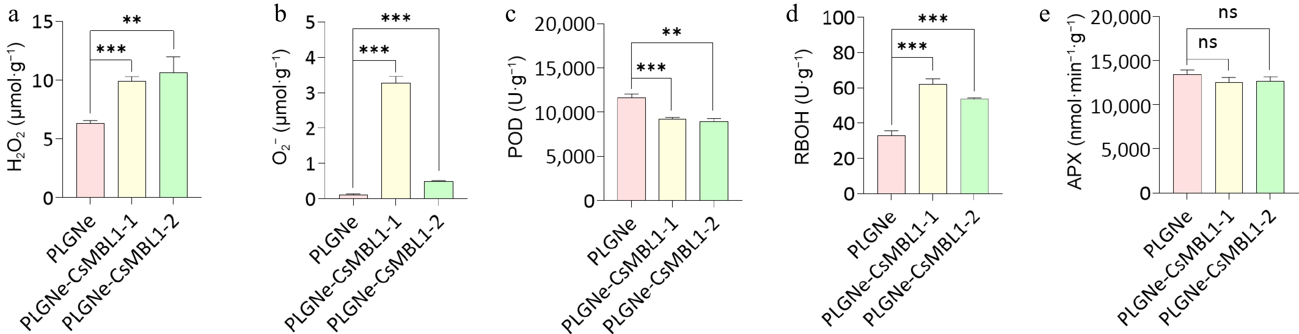 Effects of CsMBL1 overexpression on plant ROS levels. The contents of (a) H2O2, (b) O2, and activities of (c) POD, (d) RBOH, and (e) APX were measured in CsMBL1-overexpressing plants. PLGNe-CsMBL1-1/-2: CsMBL1-overexpressing transgenic lines, PLGNe: Control plants carrying the empty PLGNe vector. Data were analyzed by ANOVA with Tukey's multiple range test, p < 0.05.