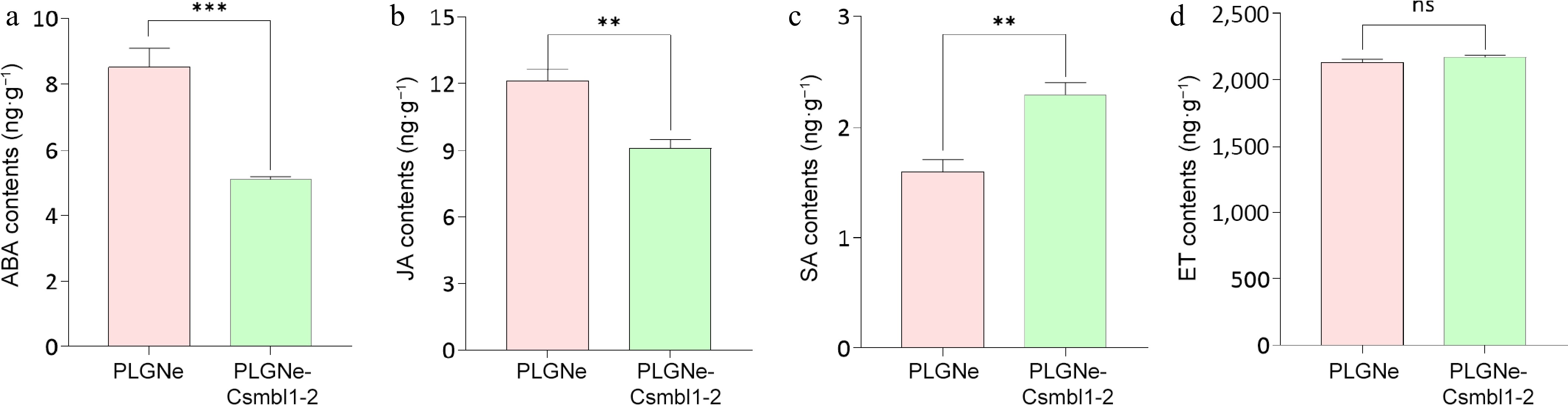 Effects of CsMBL1 overexpression on phytohormone levels. Concentrations of (a) ABA, (b) JA, (c) SA, and (d) ET were measured in CsMBL1-overexpressing plants. In (a)−(d): PLGNe-CsMBL1-2: CsMBL1-overexpressing plants. PLGNe: Control plants with an empty PLGNe vector. Data were statistically analyzed by ANOVA with Tukey's multiple range test (p < 0.05).