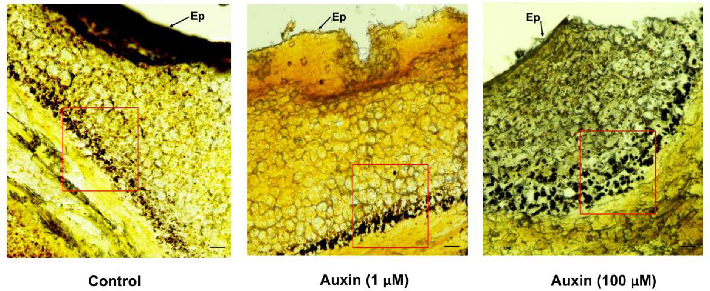 Light microscopic images of 1 μm thick sections of P. grandiflorus nectaries stained with lugol reagent. Starch granules are shown in the control, and auxin treatments in pre-secretory parenchymal cells. Ep-Epidermal layer; Bar = 100 μm.