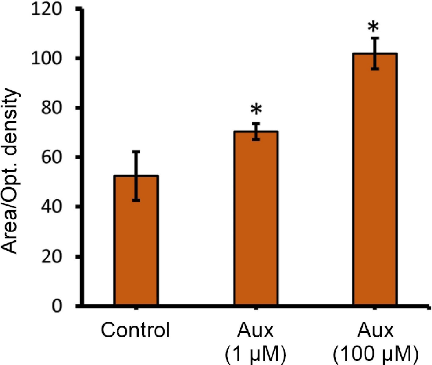To test this, Platycodon grandiflorus individual buds (~1.5 cm) (pre-secretory stage) were sprayed with 1 and 100 μM auxin solution, and water alone (control). Buds treated with auxin were collected fresh after 24 and 48 h, respectively, and immediately cold-stored at 4 °C. The stored buds were then fixed in FAA fixative, and the μm-thick sections were made using an ultra-microtome (Leica, Germany). The obtained tissue sections were stained with 5% lugol stain, and left for 1 min at room temperature. The stained sections were observed through a confocal light microscope (Nikon, Japan). No changes were observed in buds after 24 h, irrespective of the treatments (data not shown), similar to floral buds treated with 1 μM auxin (Fig. 1), whereas bud treatment with 100 μM auxin showed enhanced starch accumulation 48 h after treatment, compared to the control (Fig. 1). Quantitative analysis of starch accumulation, prior to secretion, revealed a significant effect of auxin treatment. ImageJ analysis of starch-specific staining (lugol stain) showed that the mean starch granule area per cell (mean optical density per glandular area) was significantly higher in tissues treated with 100 μM auxin, compared to the control (Fig. 2). This image-based quantification directly correlated with the observations from anatomical sectioning (Fig. 1). Histological sections of control tissues showed sparse, small starch granules in the pre-secretory cells, whereas sections from 100 μM auxin-treated tissues displayed a marked increase in both the number and size of starch granules within the same cellular compartments (Fig. 2). From these results, auxin was confirmed as being able to build up starch storage at the pre-secretory cells; however, the molecular mechanism behind this rapid carbohydrate storage is unknown.