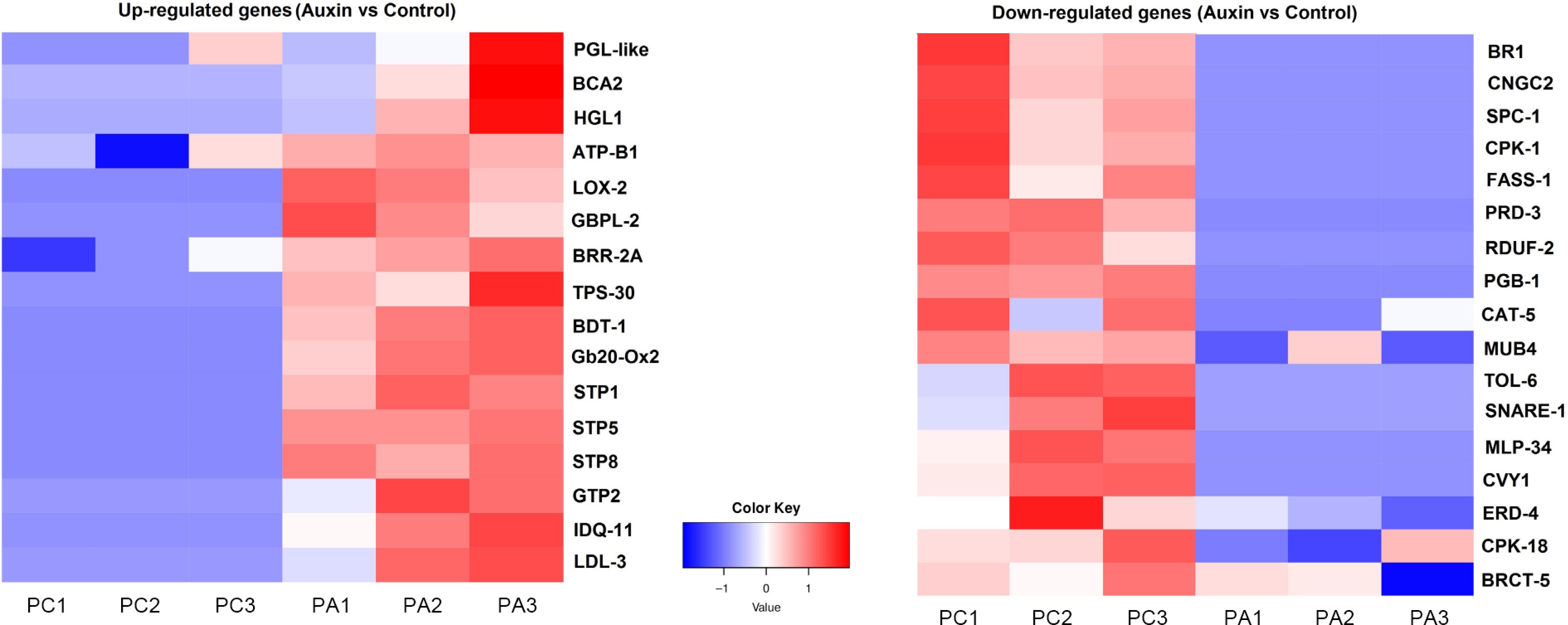 Heat map showing highly upregulated and downregulated genes (auxin vs control). Sucrose transported genes STP1 and STP2 are found to be highly upregulated under auxin treatment.