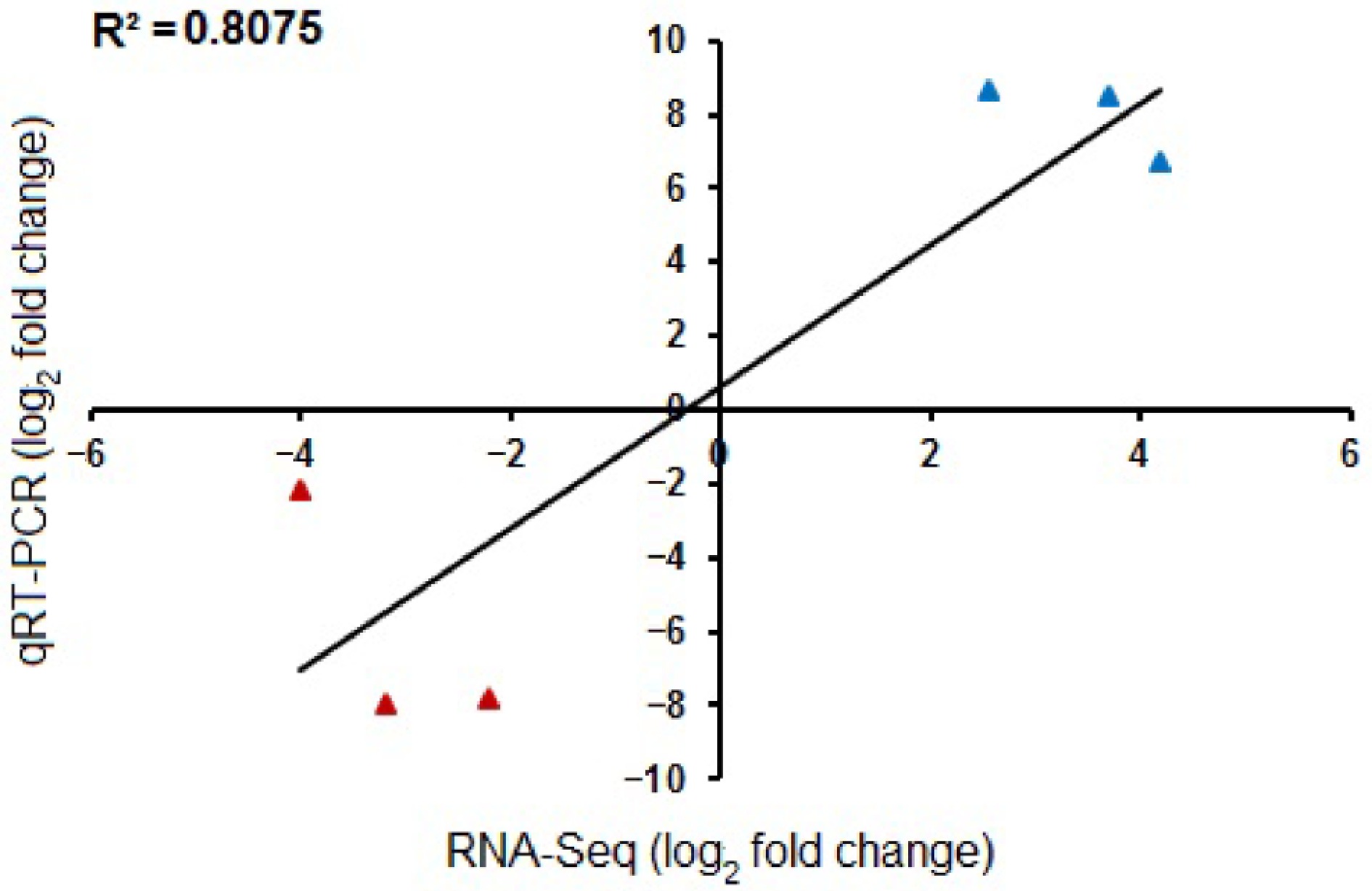 Validation of −log2FC RNA-Seq values with the −log2FC qRT-PCR gene expression values. The qRT-PCR results (both upregulated and downregulated genes) show high correlation with RNA-Seq data, as denoted by an R2 value of 0.8075. Genes used for qRT-PCR include, upregulation-STP1, STP2, and ABCG1; downregulation-SPC1, CNGC2, and BKK1.