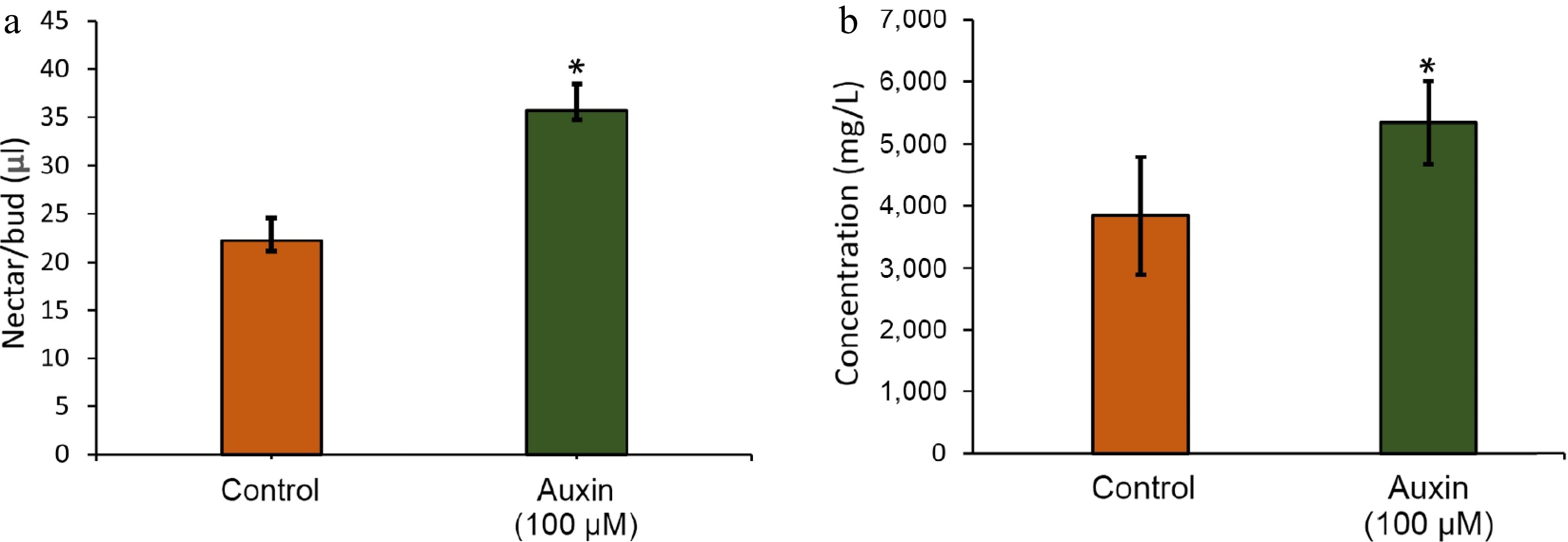 (a) Volume of nectar as physically measured using a micropipette. (b) Total sugar concentration in the nectaries treated with control and auxin treatment.