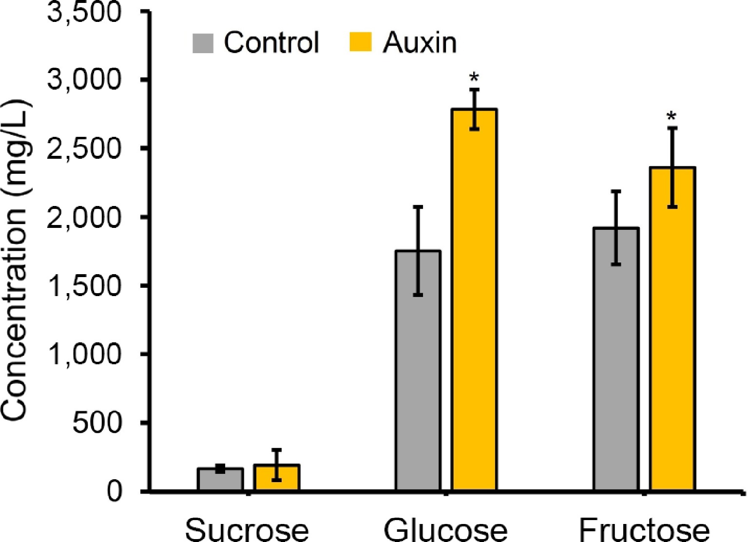 Sugar component analysis from the nectar obtained (control and auxin [100 uM] treatments). Sugar components were detected using the HPLC method. * Represents statistical significance between the treatments.
