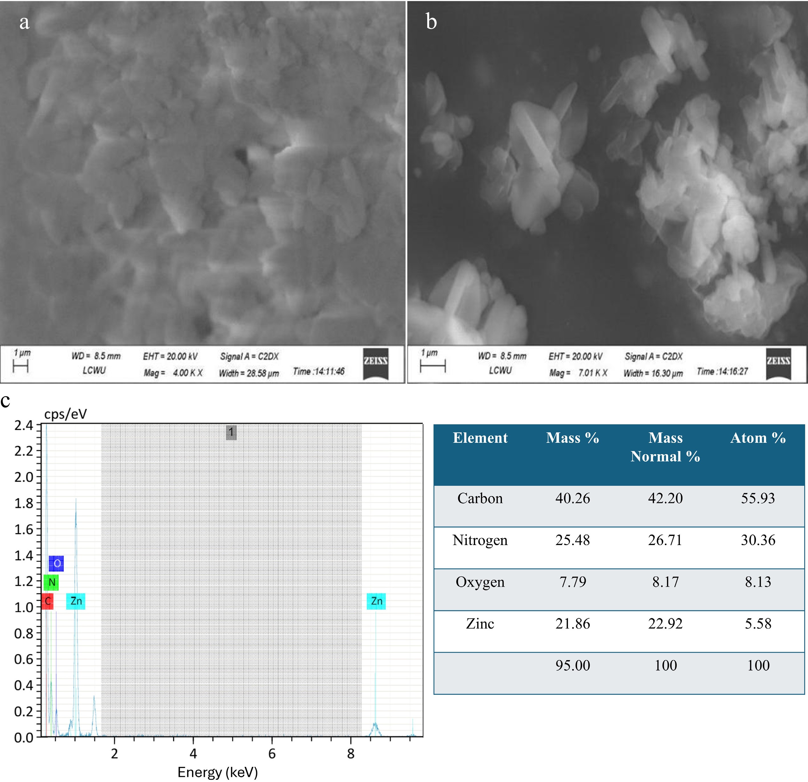 Elemental distributions on the surface of Zn-MOFs were investigated using EDX analysis. As shown in Fig. 2, MOFs mainly consist of carbon, nitrogen, oxygen, and zinc. The percentage composition of these elements is shown in the table within this figure[39].