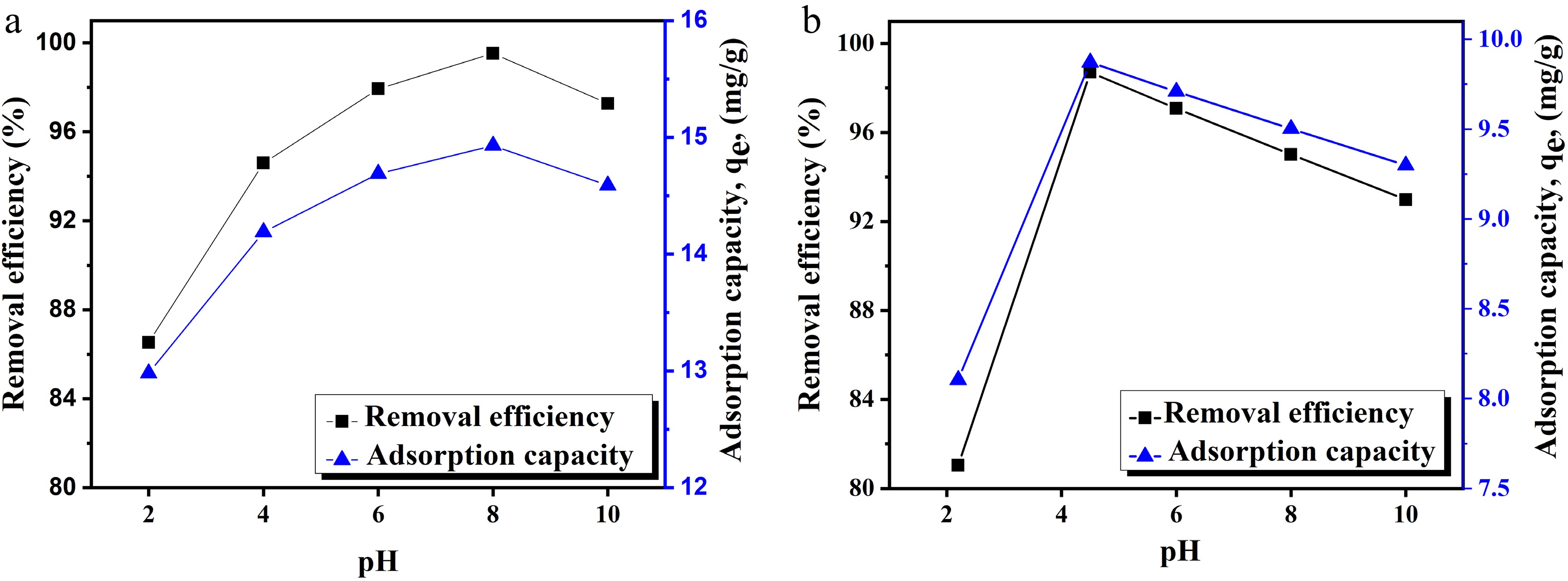 The pH of the solution strongly influences the adsorption of heavy metal ions from aqueous solutions[43]. Since it affects the distribution of ions, as well as charge on adsorbent's surface, the effect of pH on the adsorptive removal of Cu(II) and Pb(II) ions was studied. To find the optimal pH, batch adsorption experiments were conducted across the pH range of 2–10. The reaction was carried out at 150 rpm and 30 °C. The results indicated that the adsorption capacity and removal efficiency of MOFs increased with pH up to an optimal point, beyond which, both began to decrease gradually as shown in Fig. 3a, b. The PZC value explains the reason for the maximum removal of cations in a basic medium. Furthermore, at pH 4.5, Cu remains in its free ionic form, which readily binds to any available adsorbent sites. Similarly, around a neutral pH, Pb(II) ions are less tightly bound, although in a strong basic medium Pb(II) starts to form hydrolyzed complexes or precipitates, which limit further adsorption on the surface of the adsorbent. The optimum pH was found 4.5 and 8, with removal efficiency 98.7% and 99.5% for Cu(II) and Pb(II) ions, respectively.