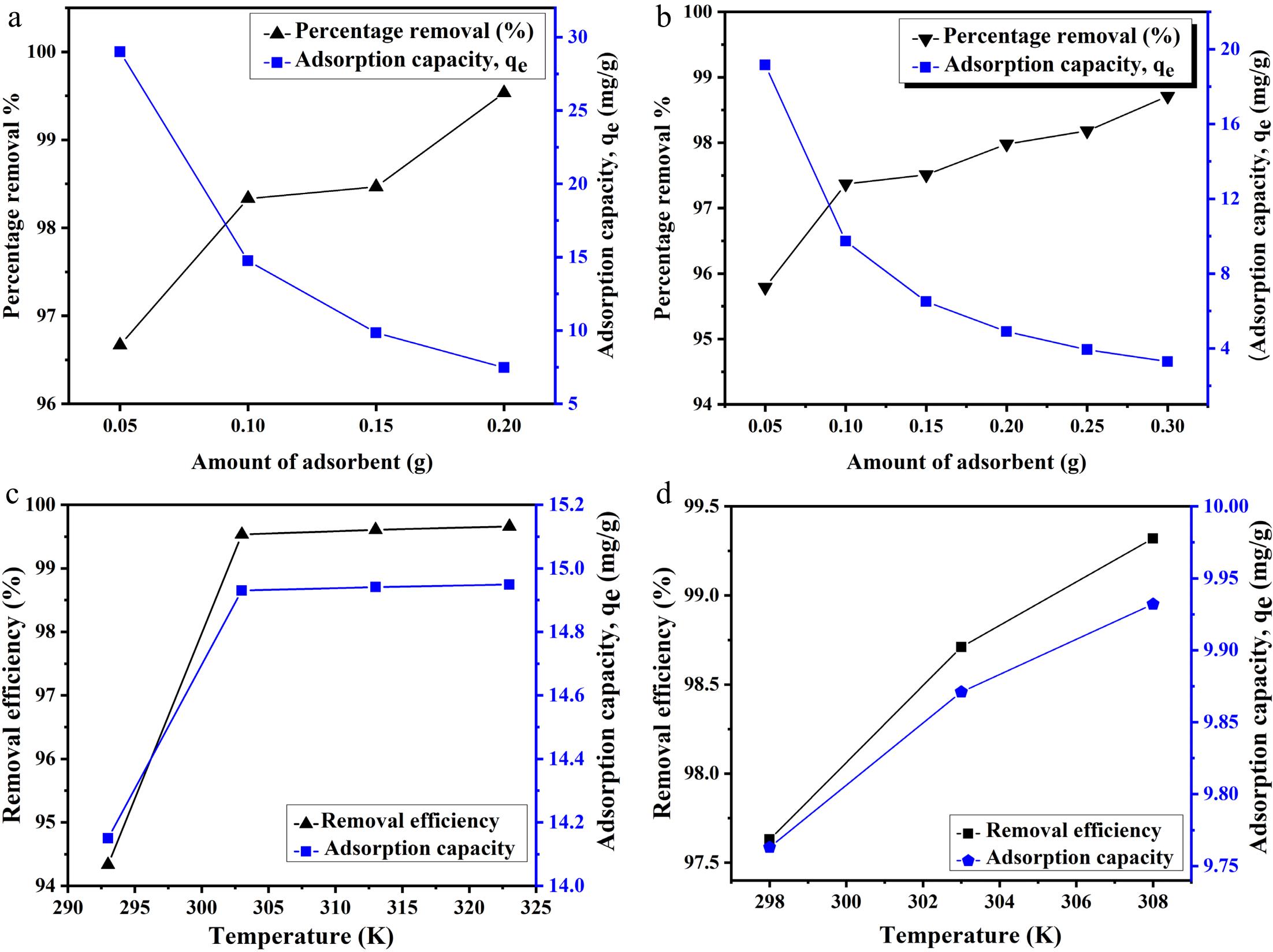 Effect of adsorbent dosage on removal efficiency and adsorption capacity for (a) Pb and (b) Cu ions. Effect of temperature on the adsorption of (c) Pb and (d) Cu ions.