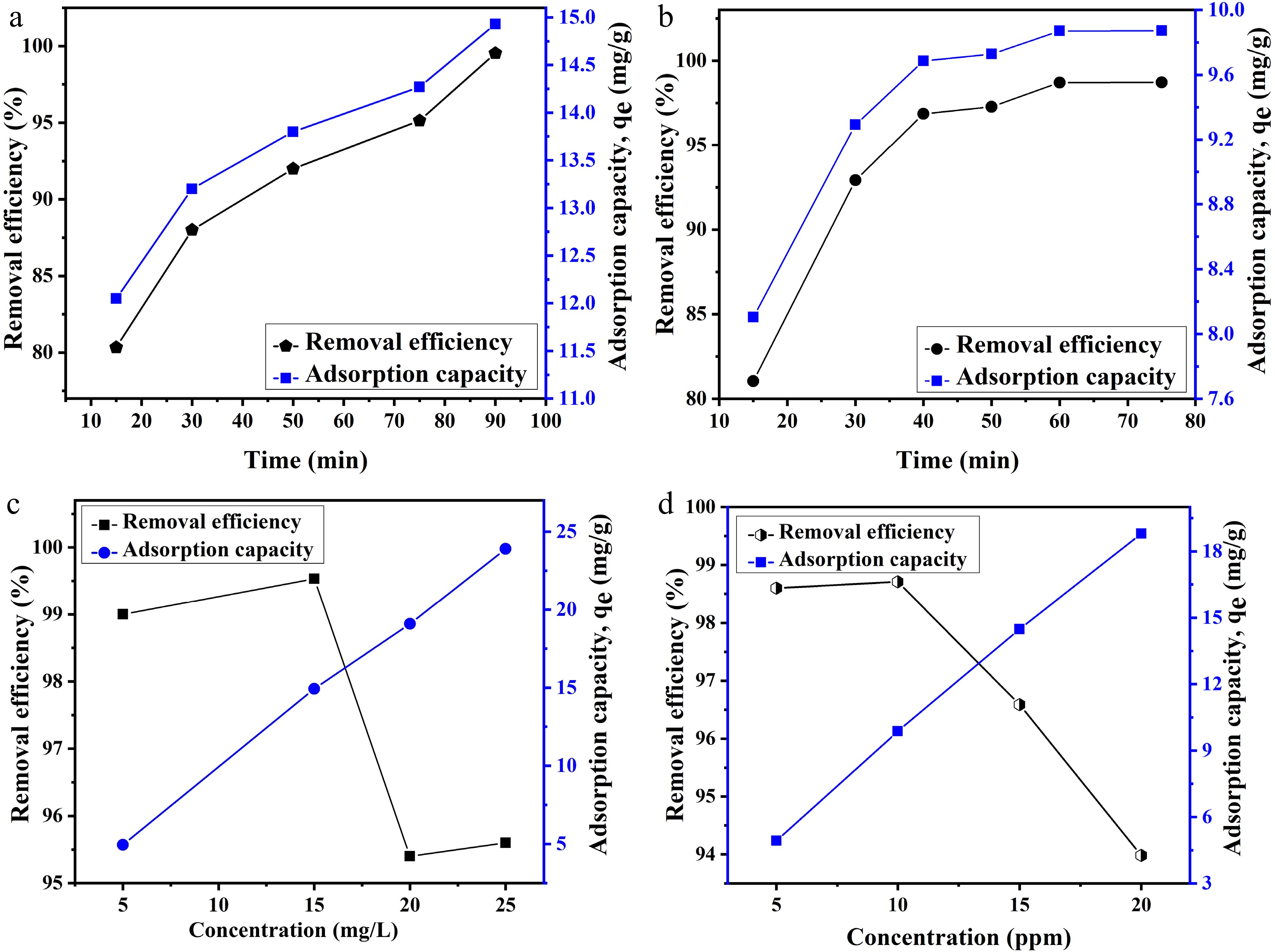 Effect of time on the adsorption of (a) Pb and (b) Cu ion. Effect of the concentration of metal ions on adsorption of (c) Pb and (d) Cu ions.