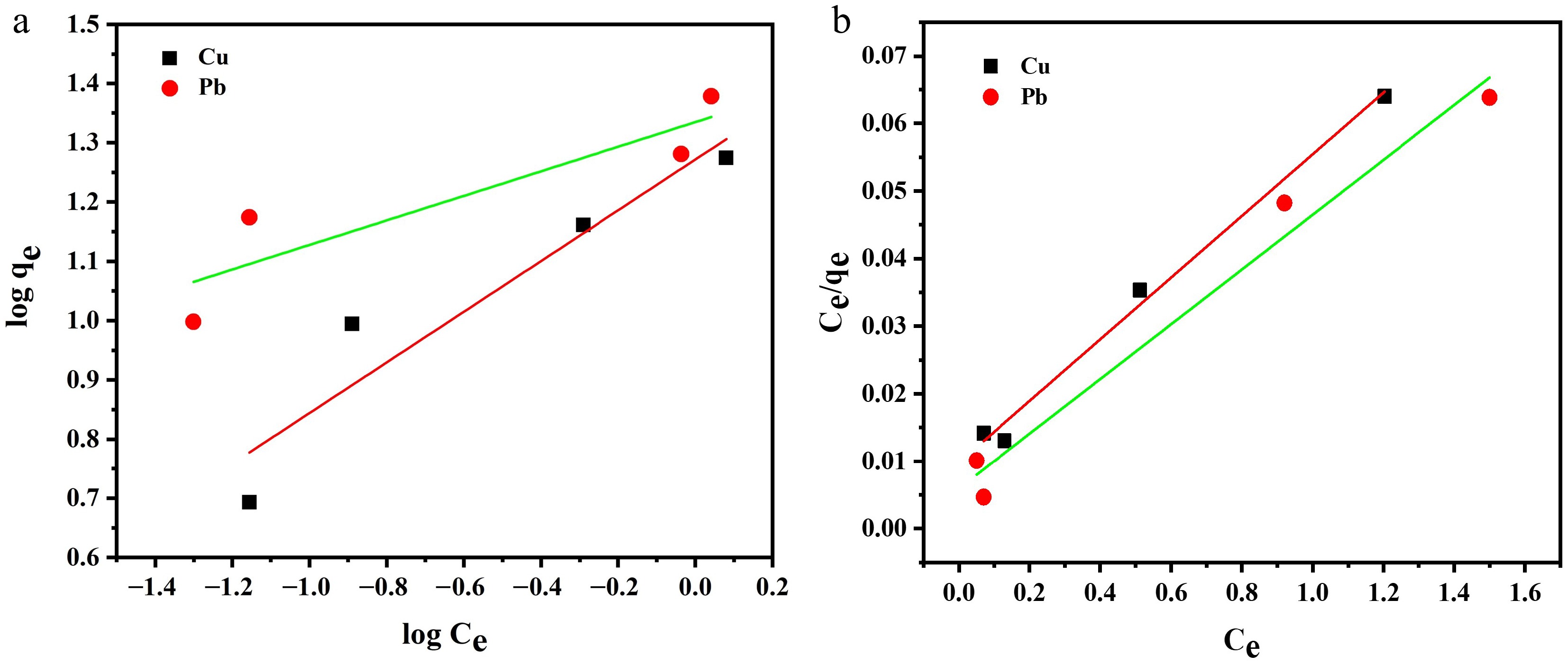 To properly investigate the removal mechanism of copper and lead ions and their interaction with Zn-based MOFs, adsorption isotherms were studied. Different initial metal ion concentrations were prepared, and batch adsorption experiments were performed. Adsorption equilibrium data for both metal ions were investigated by fitting both Freundlich and Langmuir adsorption isotherms (Fig. 7a, b). The Freundlich isotherm is used to study reversible and multilayer adsorption processes (Equation 4), whereas the Langmuir model (Equation 5) explains monolayer adsorptive behavior[47,48].
