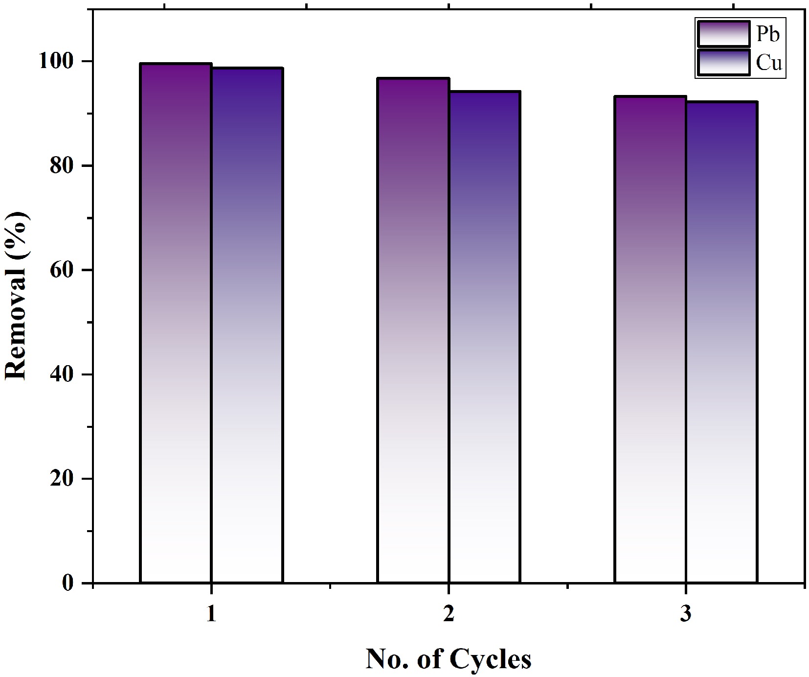 MOFs remaining as a residue after a contact time of 60 and 90 min were centrifuged, separated, dried, regenerated, and used for lead and copper ion removal without any chemical treatment. The adsorption capacity and removal effectiveness of this residual material was calculated using Eqs (1) and (2). For three successive cycles, the percentage removal is shown in Fig. 9. Removal efficiency was found to be around 93% and 92% for lead and copper ions, respectively. These results suggest that zinc-based MOFs are an efficient and cost-effective adsorbent that can be reused for at least three or four cycles without any treatment[23]. Metal loaded on the MOFs was discarded by encapsulating it in inert matrices to prevent environmental pollution.