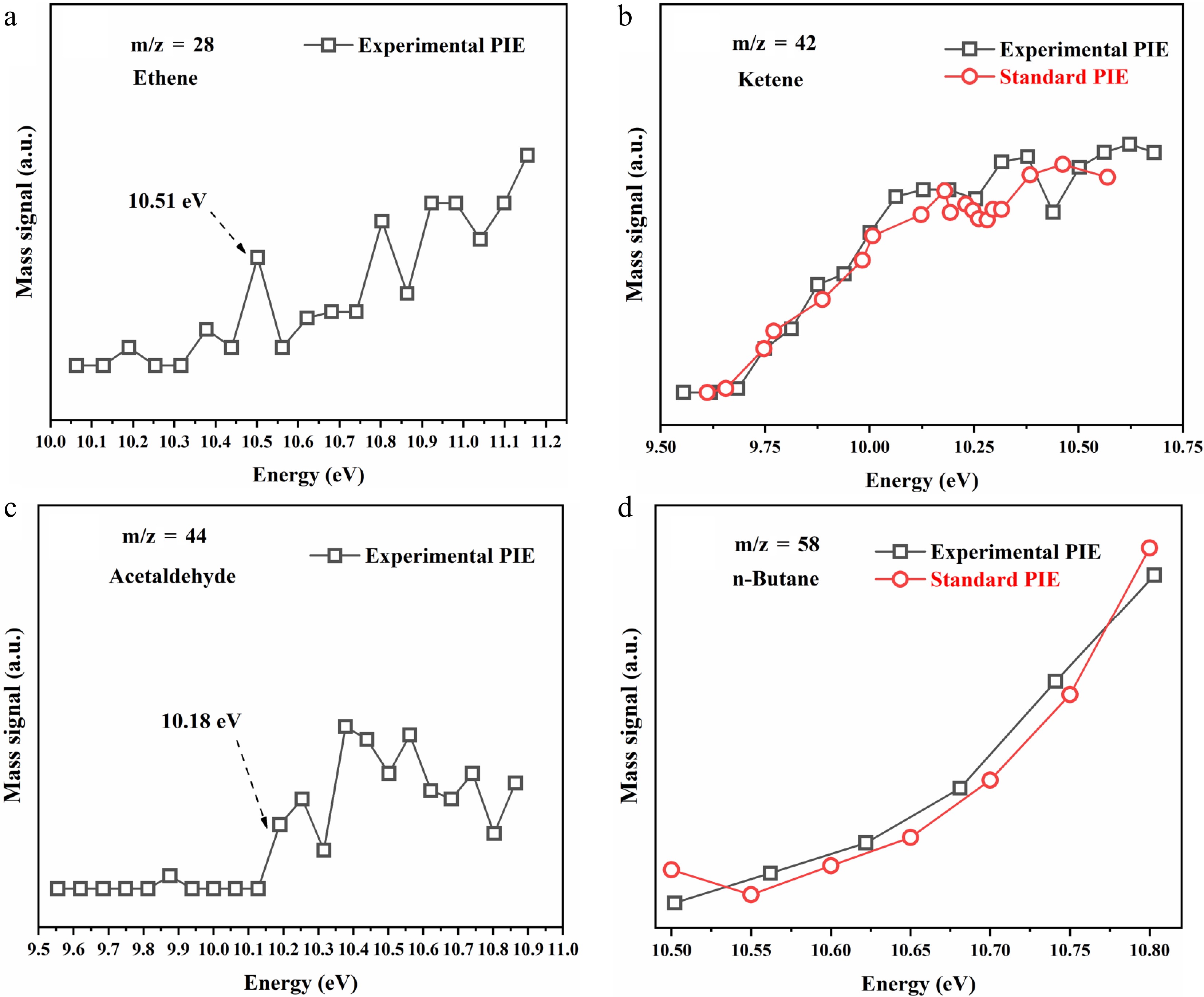 Species identification of the main products in the Co4Zr1-based catalytic oxidation of propane, showing the PIE spectra and identification results of (a) m/z = 28 (C2H4), (b) m/z = 42 (C2H2O), (c) m/z = 44 (C2H4O), and (d) m/z = 58 (C4H10) during the catalytic combustion process of propane.