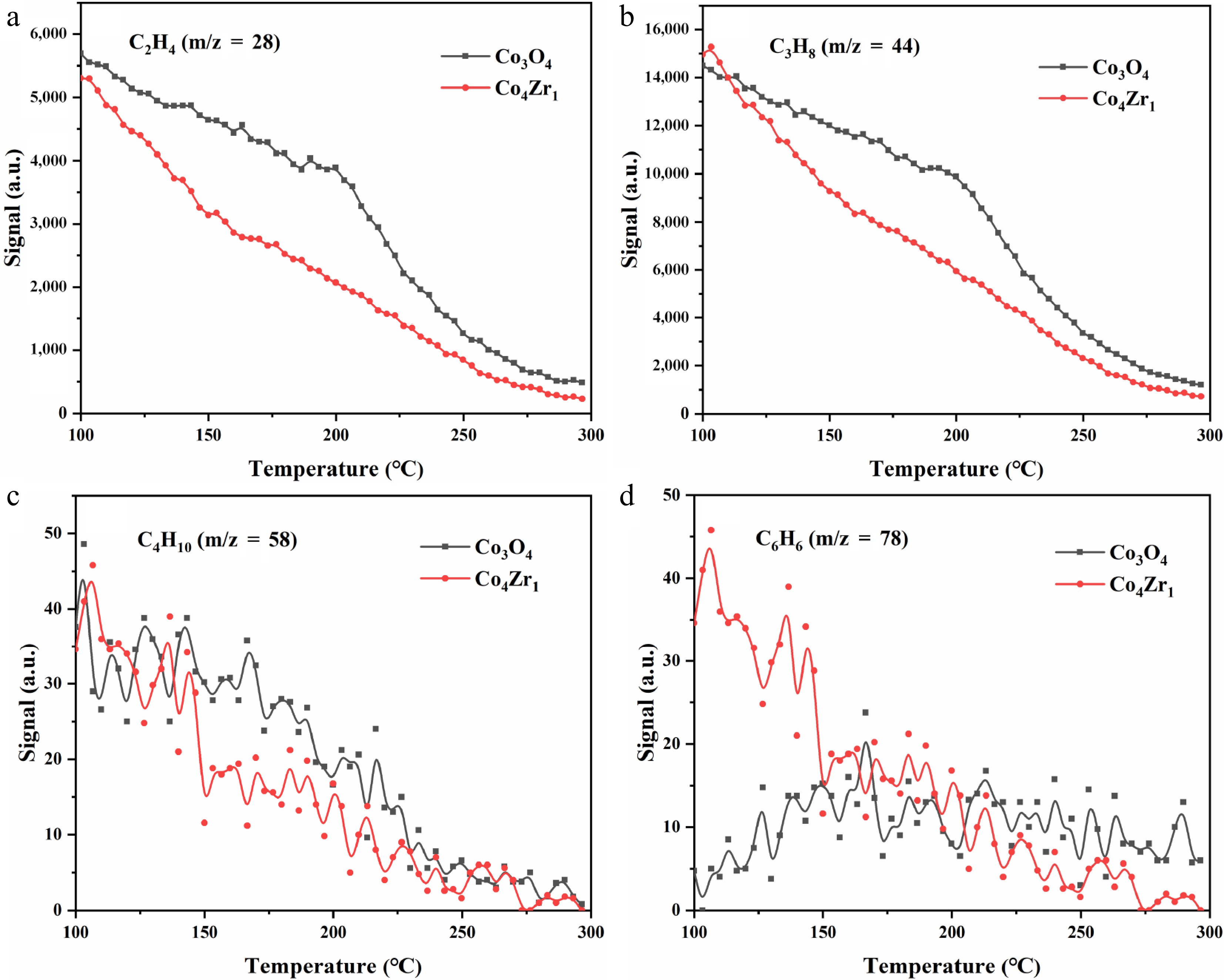 Figure 3 displays the temperature-programmed surface reaction (TPSR) profiles monitoring the evolution/consumption of hydrocarbon species (C2H4 [m/z = 28], C3H8 [m/z = 44], C4H10 [m/z = 58], and C6H6 [m/z = 78]) over Co3O4 and Co4Zr1 catalysts in the 100–300 °C range. All hydrocarbon signals exhibit progressive attenuation with increasing temperature, indicative of oxidative consumption at the catalysts' surfaces. Comparative analysis reveals accelerated signal decay rates for hydrocarbon species over Zr-doped Co4Zr1 compared with pristine Co3O4 (particularly evident in Fig. 3a, b). This demonstrates enhanced oxidation activity through the incorporation of Zr, exemplified by lower temperature thresholds for the conversion of ethylene and propane over Co4Zr1. For butane and benzene (Fig. 3c, d), despite signal fluctuations, Co4Zr1 maintains superior oxidative performance: butane oxidation diverges significantly above 200 °C, whereas benzene conversion shows marked differences below 150 °C. Notably, the substantially lower signal intensities of butane (C4H10) and benzene (C6H6) compared with those of ethylene and propane suggest their limited formation as minor byproducts rather than primary intermediates. This implies that higher-carbon species (C ≥ 4) represent secondary pathways with negligible contributions to the dominant reaction network and product distribution. The systematic increase in hydrocarbon oxidation performance across all monitored species confirms that Zr doping effectively optimizes the redox functionality of Co-based catalysts, likely through improved oxygen mobility and stabilized active sites.