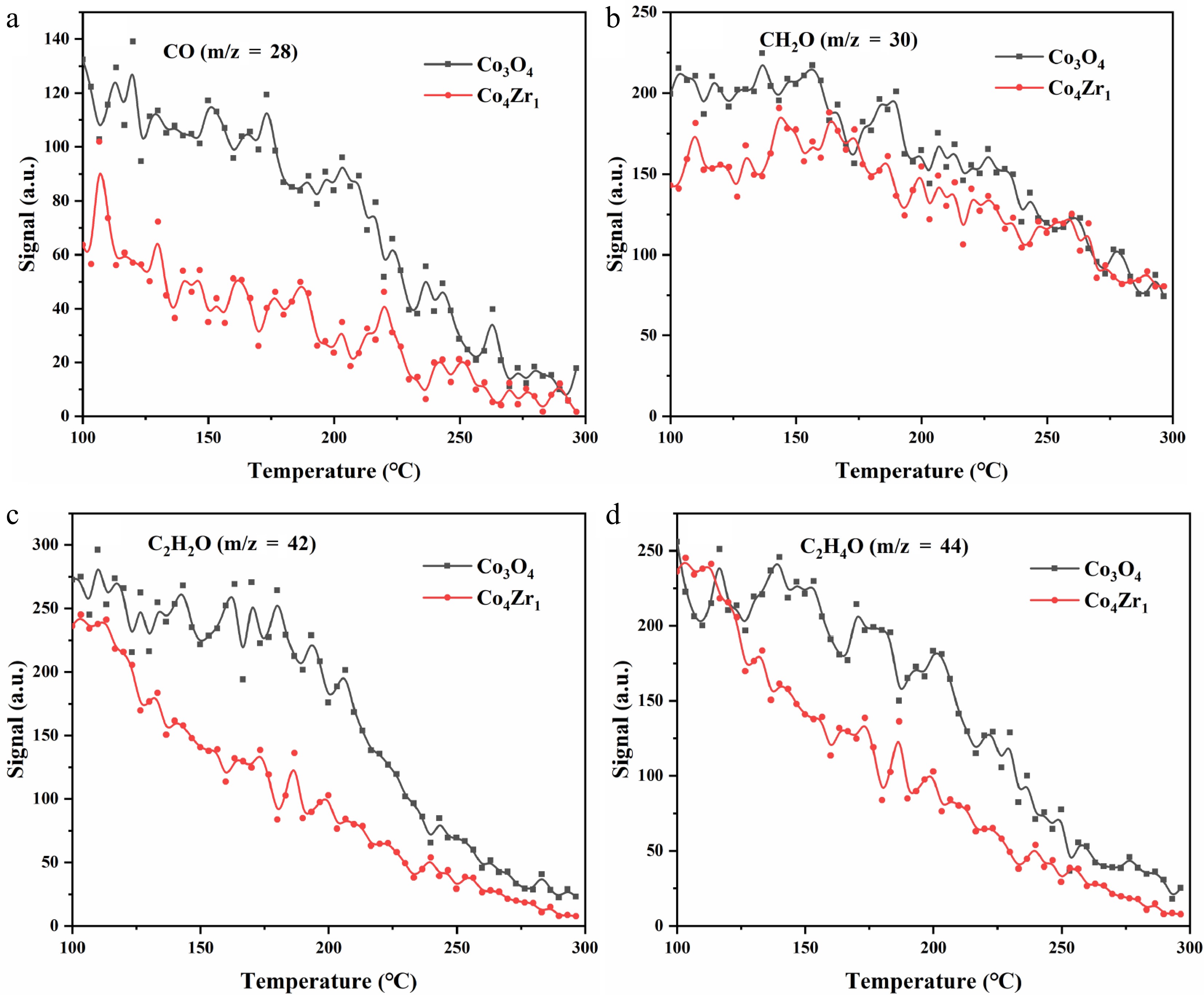 Figure 4 presents the TPSR profiles of oxygenated intermediates over Co3O4 and Co4Zr1 catalysts, including carbon monoxide (CO, m/z = 28; Fig. 4a), formaldehyde (CH2O, m/z = 30; Fig. 4b), ketene (C2H2O, m/z = 42; Fig. 4c), and acetaldehyde (C2H4O, m/z = 44; Fig. 4d). These oxygenated species represent critical intermediates in catalytic combustion of propane, and their oxidative transformation characteristics provide mechanistic insights into their reaction pathways and catalytic performance. The experimental results revealed progressive signal attenuation for all the oxygenated intermediates with increasing temperature (100–300 °C), demonstrating their sequential oxidative consumption on the catalysts' surfaces. Notably, compared with pristine Co3O4, Zr-doped Co4Zr1 exhibited superior oxidative activity across all the monitored species. Pronounced disparities emerge in the converstion of CO ( Fig. 4a) and acetaldehyde ( Fig. 4d), where Zr modification markedly accelerates their transformation to terminal oxidation products (CO2 and H2O). For ketene ( Fig. 4c), despite inherently weaker signals, Co4Zr1 maintains a distinct activity advantage above 150 °C, whereas acetaldehyde oxidation (Fig. 4d) shows consistently increased performance over the entire temperature range.