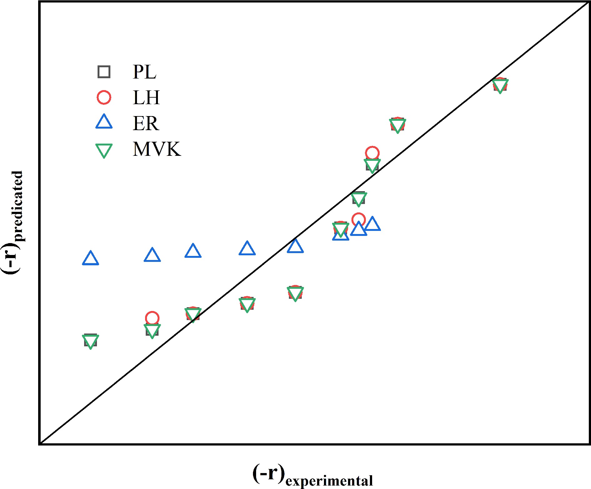 Comparison of the predicted and experimental values of the catalytic combustion reaction rate model of propane on Co4Zr1.