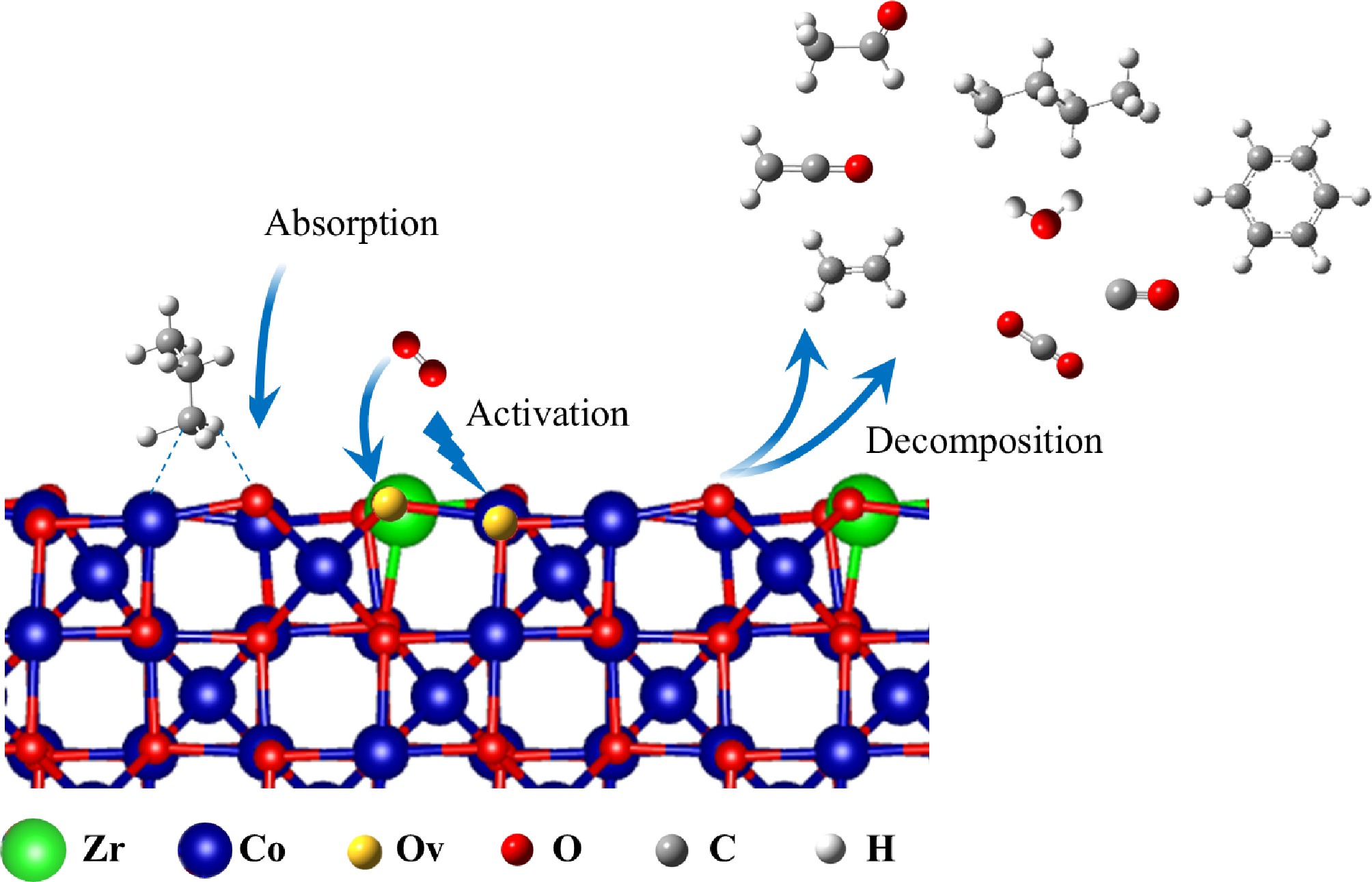Transition metal oxides (e.g., Ce, Mn, Co) have shown promising catalytic performance in VOC combustion[10]. Cobalt oxide (Co3O4) is particularly effective for catalytic combustion of propane[11]. In its spinel structure, Co2+ ions occupy tetrahedral sites, whereas Co3+ resides in octahedral positions. Although debates persist regarding the roles of Co2+ and Co3+, the consensus suggests that Co3+ serves as the primary active site for oxidation[12]. The reduction of Co3+ to Co2+ generates oxygen vacancies, facilitating the adsorption and activation of O2[13]. Enhanced catalytic activity is achieved by exposing the (220) facet, which promotes the formation of oxygen defects[14]. Morphological engineering (e.g., nanospheres, mesoporous structures) to maximize exposure of the (220) facet has become a key strategy[15,16]. Metal doping further modulates electronic and structural properties, as evidenced by improved activity and stability in bimetallic systems such as Co–Mn–O and Cu–Co–O[17]. Zirconia (ZrO2), renowned for its redox amphoterism and thermal stability, activates O2 via surface paramagnetic F-centers to generate OV[18]. Despite its wide use as a support for noble metals and transition metals (e.g., Pt/ZrO2 for methane oxidation[19] and ZnZrxOy for propane combustion[20]), its role as a dopant in low-carbon pollutant oxidation remains underexplored, necessitating further study of Zr-based synergistic effects.