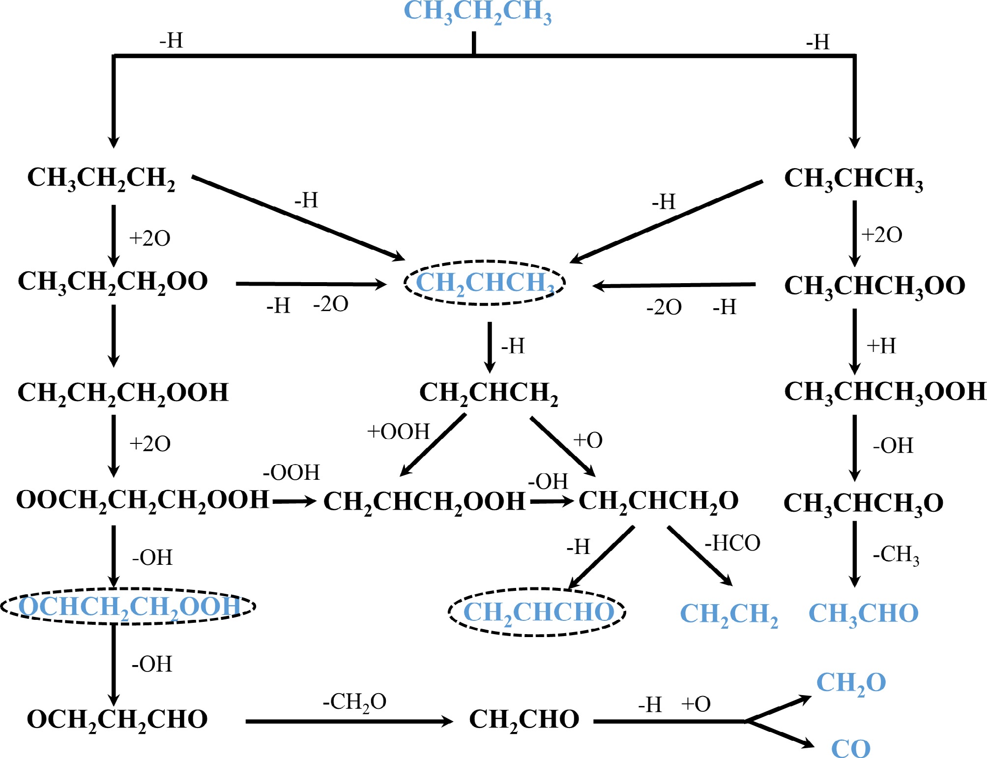 According to the Chemkin simulation of gas-phase combustion of propane under equivalent atmospheric conditions, the main pathway for low-temperature oxidation, as illustrated in Fig. 7, begins with propane undergoing a dehydrogenation reaction (-H) to lose a hydrogen atom, forming two types of propyl radicals: n-propyl (CH3CH2CH2) and isopropyl (CH3CHCH3) (R3.5 and R3.6). Concurrently, both propyl radicals can undergo further dehydrogenation to generate propene (R3.7 and R3.8). Following oxidation, the n-propyl and isopropyl radicals, respectively, form n-propylperoxy (CH3CH2CH2OO) and isopropylperoxy (CH3CHCH3OO) radicals (R3.9 and R3.10). Subsequently, these peroxy radicals can eliminate a hydroperoxyl radical to regenerate propene (R3.11 and R3.12). From here, the reaction pathways diverge. The CH3CH2CH2OO radical can isomerize into a CH2CH2CH2OOH radical (R3.13), which is then oxidized to an OOCH2CH2CH2OOH radical (R3.17). This species can then either lose a hydroxyl radical to form OCHCH2CH2OOH (R3.18) or lose a hydroperoxyl radical (OOH) to create a CH2CHCH2OOH radical (R3.19). The OCHCH2CH2OOH radical proceeds to lose another hydroxyl radical, forming an OCH2CH2CHO radical (R3.20), which is followed by the loss of a formaldehyde (CH2O) molecule to produce a CH2CHO radical (R3.21). This final radical undergoes oxidative dehydrogenation to yield formaldehyde and carbon monoxide (R3.22). In a parallel path, the CH3CHCH3OO radical, upon hydrogenation, forms a CH3CHCH3OOH radical (R3.14), which then produces acetaldehyde by losing a hydroxyl and a methyl radical (R3.15 and R3.16). On another pathway, propene itself can be dehydrogenated to an allyl radical (CH2CHCH2) (R3.23), which subsequently reacts with OOH to produce a CH2CH2CH2OOH radical (R3.24). This radical can then be oxidized (R3.25) or lose a hydroxyl radical (R3.26) to form a CH2CH2CH2O radical. Finally, this CH2CH2CH2O radical can either lose a hydrogen atom to form acrolein (CH2CHCHO) (R3.27) or lose a formyl radical (HCO) to form ethylene (R3.28).