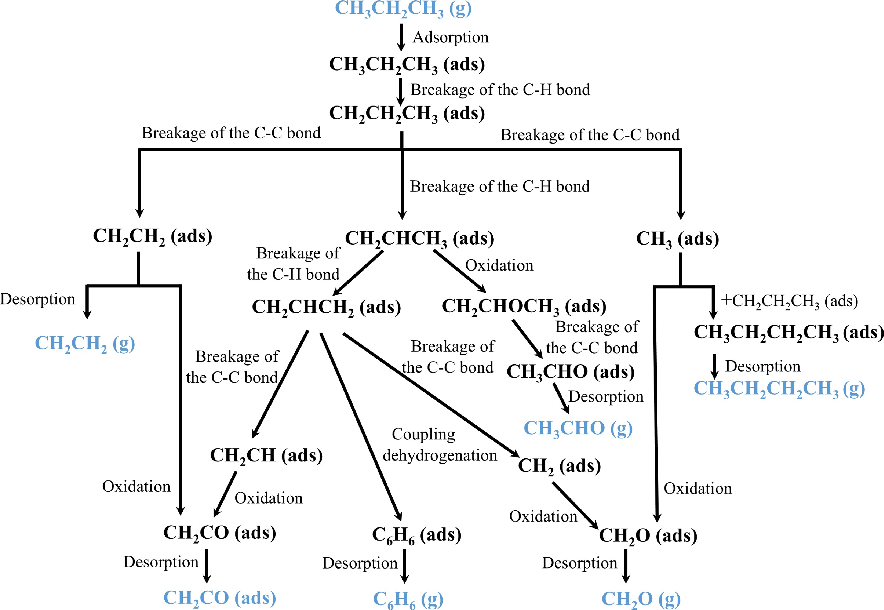 Since the actual catalytic reaction temperature is below 300 °C, a condition under whichit is difficult for gas-phase combustion reactions to occur, and considering that numerous gas-phase intermediates were not detected in the SVUV-PIMS experiments, it can be inferred that these intermediate products are more likely generated during the conversion of propane on the catalyst's surface. A possible reaction pathway for this surface-mediated process is illustrated in Fig. 8. The mechanism begins with the adsorption of CH3CH2CH3 on the catalyst (R3.29). Serving as strong Lewis acid sites, Co3+ ions promote the heterolytic cleavage of a C-H bond in propane to form CH2CH2CH3 (ads) (R3.30). This adsorbed propyl species can then undergo C-C bond scission to yield CH2CH2 (ads) and CH3 (ads) (R3.31), with the resulting CH2CH2 (ads) desorbing to produce ethylene (R3.33). Concurrently, CH2CH2CH3 (ads) may undergo C-H bond cleavage to form CH2CHCH3 (ads) (R3.32), which can then undergo another C-H bond cleavage to form CH2CHCH2 (ads) (R3.34). The CH2CHCH3 (ads) species reacts with active oxygen in the catalyst to form CH2CHOCH3 (ads) (R3.35), which subsequently undergoes C-C bond cleavage to form CH3CHO (ads) before desorbing into the gas phase as acetaldehyde (R3.36, R3.37). In another pathway, the CH2CHCH2 (ads) species undergoes C-C bond scission to yield CH2CH (ads) and CH2 (ads) (R3.38). The CH2CH (ads) species reacts with active oxygen to form CH2CO (ads) (R3.39); alternatively, CH2CH2 (ads) can also be oxidized on the surface to form CH2CO (ads) (R3.40), which desorbs as ketene (R3.41). Similarly, CH2 (ads) and CH3 (ads) are further oxidized on the catalyst's surface to CH2O (ads) (R3.42, R3.43), which then desorbs into the gas phase as formaldehyde (R3.44). Notably, n-butane is formed through an addition reaction between a CH3 (ads) species and a CH2CH2CH3 (ads) species, producing CH3CH2CH2CH3 (ads), which then desorbs from the surface (R3.45, R3.46). Finally, the formation of benzene is attributed to the coupling and cyclization of CH2CHCH2 (ads) species, followed by successive C-H bond cleavages (R3.47, R3.48).