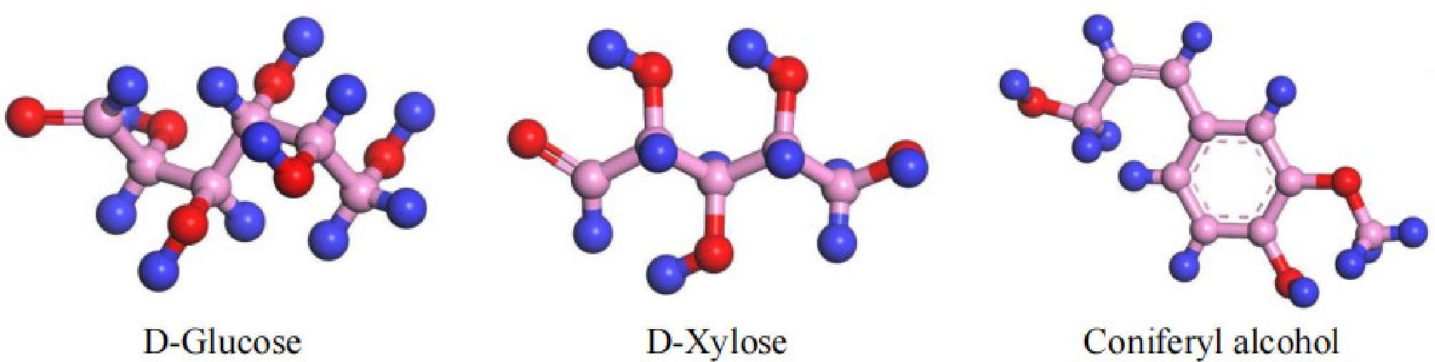 The content of each component in bagasse was as follows: cellulose (32% to 48%), hemicellulose (19% to 24%), lignin (23% to 32%), and ash (about 4%). Cellulose was a polymer formed by the condensation of many glucose molecules undergoing β-1,4 glycosidic bonding. The lignin in bagasse mainly consisted of somberol alcohol, while the hemicellulose was predominantly made up of xylose. The glycosidic bonds in the long chains of cellulose and xylose were broken to produce D-glucose and D-xylose during pyrolysis. The corresponding monomers of each part—D-glucose, D-xylose, and somberol alcohol—were selected as the modal compounds of cellulose, hemicellulose, and lignin in this study.