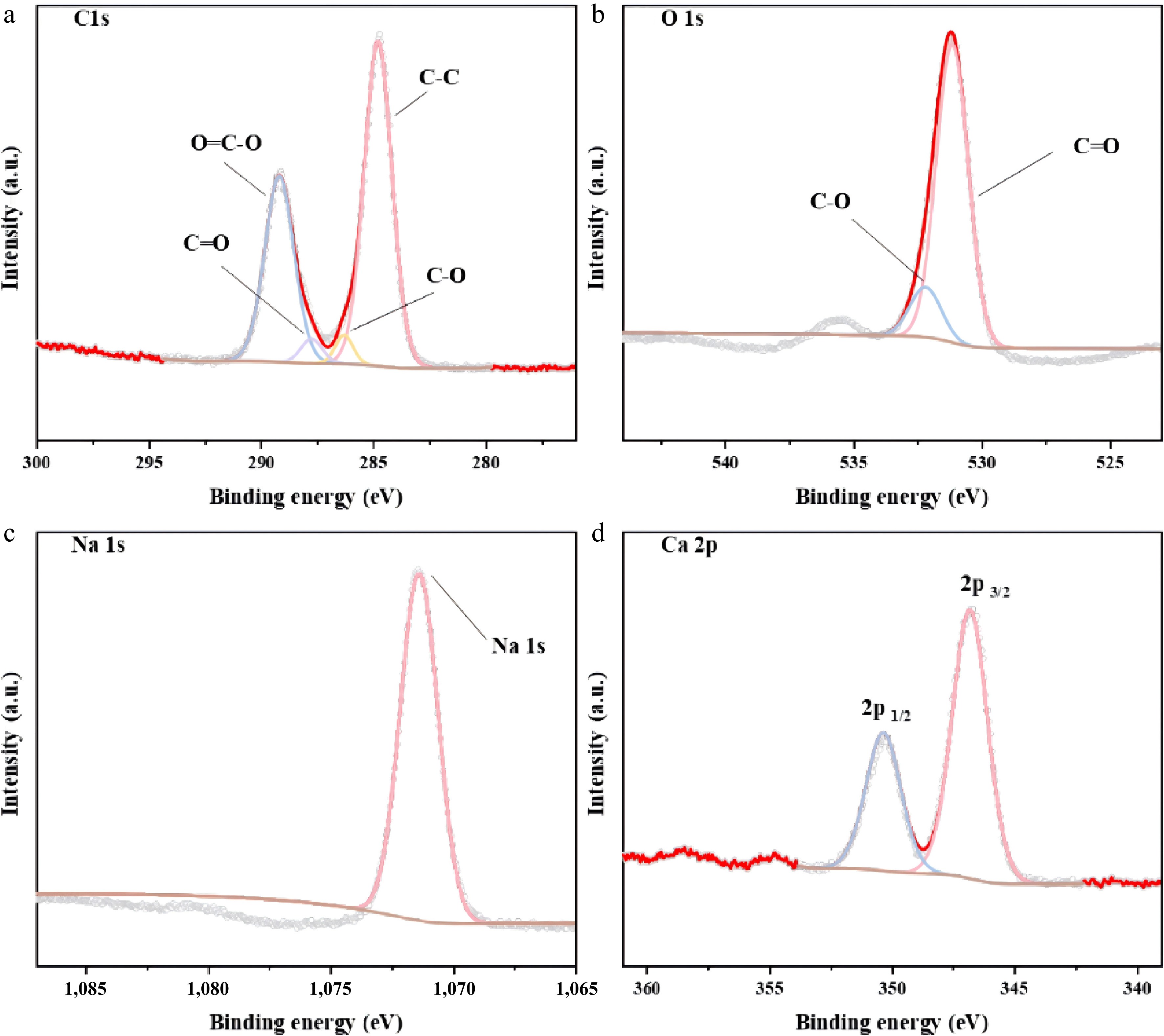 The XPS spectra of the mixed catalysts (CaO : Na2CO3 = 1:3) are shown in Fig. 10. Analysis of Fig. 10a reveals that the C1s spectrum has peaks at binding energies of 284.8, 286.2, 287.8, and 289.2 eV, corresponding to C-C, C-O, C=O, and O=C-O, respectively[43]. Analysis of Fig. 10b reveals that the O1s spectrum exhibits peaks at binding energies of 531.2 and 532.2 eV, corresponding to C=O and C-O, respectively[44]. As shown in Fig. 10c, the characteristic peak of Na1s is observed at a binding energy of 1,071.4 eV, which is consistent with the Na+. Figure 10d shows the characteristic Ca2p3/2 peak at a binding energy of 346.8 eV, and the characteristic Ca2p1/2 peak at a binding energy of 350.3 eV, which corresponds to Ca2+. Combined with Fig. 10a and b, the binding energies of the C and O were analyzed. The bond connection corresponded to CO32− in Na2CO3. The characteristic peak corresponding to Ca-O does not appear in Fig. 10b, probably because of the low CaO content in the catalyst, resulting in a weak peak shape and insignificant detection. The presence of Na+ and Ca2+ in Fig. 10c and d indicates the presence of Na and Ca, which are consistent with the valence states of CaO and Na2CO3. The material primarily consists of C, O, Ca, Na, and N, with atomic percentages of 36.84%, 37.19%, 10.96%, 14.5%, and 0.51%, respectively.