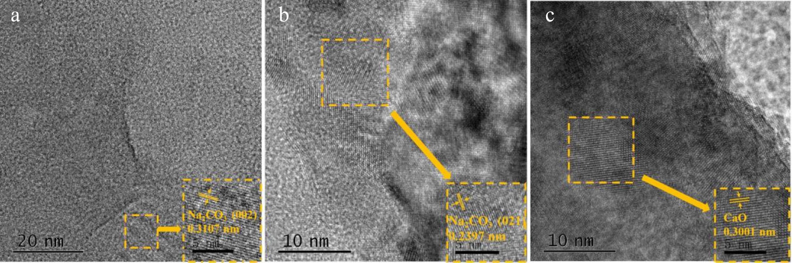 The TEM pattern of the Na2CO3 catalyst is shown in Fig. 11a, while the TEM patterns of the mixed catalyst (CaO : Na2CO3 = 1:3) are shown in Fig. 11b and c. These patterns were analyzed to determine the presence of substances. The lattice spacing of 0.3107 nm in Fig. 11a matches that of the (002) crystal plane of Na2CO3. The lattice spacing of 0.2397 nm shown in Fig. 11b corresponds to the (021) crystal plane of Na2CO3. The separation between the lattices of 0.3001 nm in Fig. 11c is consistent with that of CaO. These lattice spacings indicate the presence of corresponding substances. Meanwhile, the existence of anisotropy causes the substances to exhibit different properties in different directions. The different crystal planes of belonging to the same substance were measured.