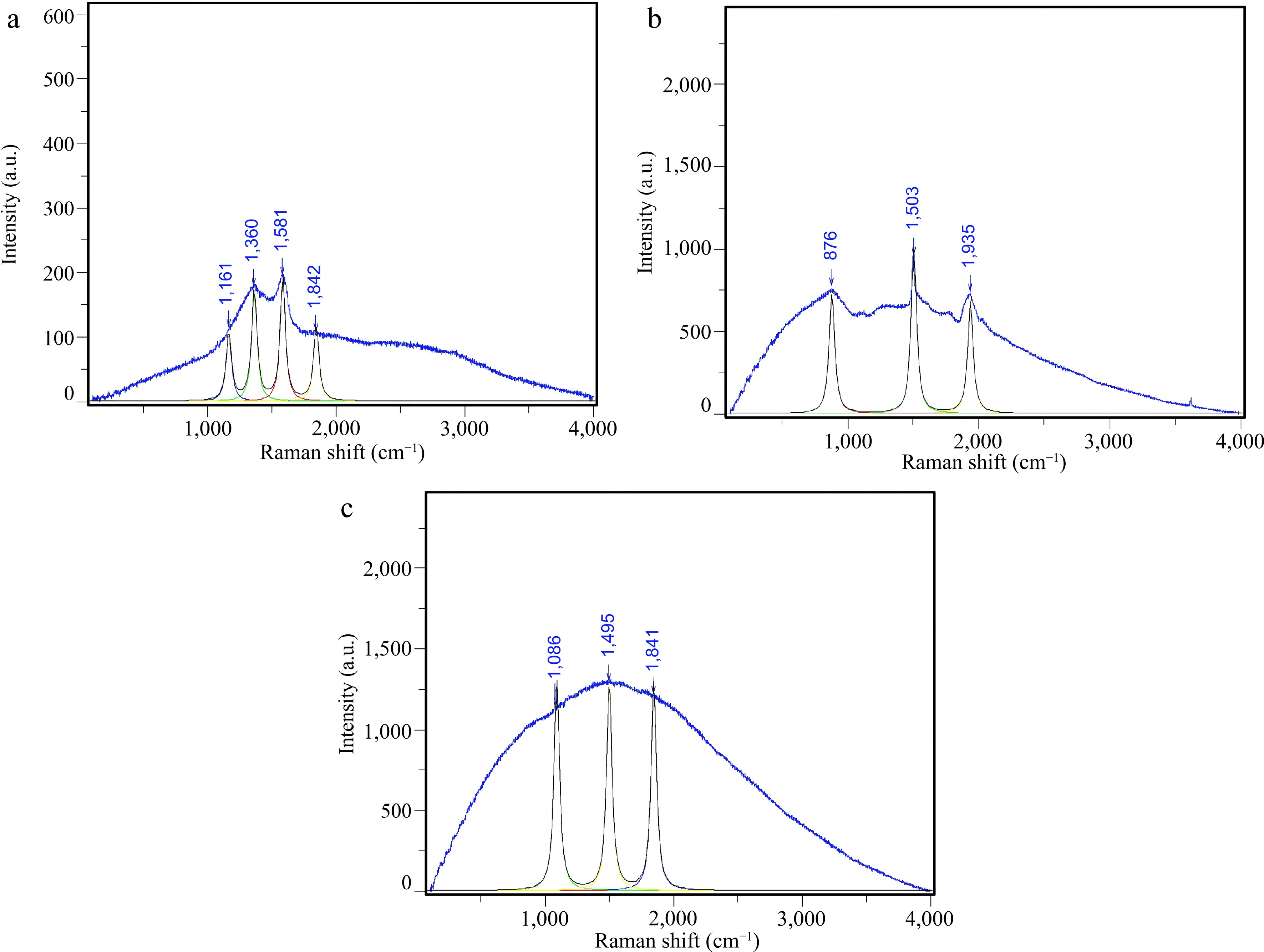 The Raman spectrum of Na2CO3 after catalyzed pyrolysis is shown in Fig. 12a. The main characteristic peaks were located at 1,161, 1,360, 1,581, and 1,842 cm−1. The 1,161 cm−1 peak is usually associated with C-O-C or C-C vibrational modes. This may originate from the residual structures of incompletely carbonized cellulose or hemicellulose. The 1,360 cm−1 peak is the typical D band, representing defects in the disordered carbon structures. The 1,581 cm−1 peak is the G band, indicating the presence of ordered graphite layers or aromatic carbon planes in the carbon material. The peak at 1,842 cm−1 could be related to oxygen-containing functional groups such as C=O, suggesting that more oxygen-containing structures were generated in the presence of Na2CO3. Overall, the Na2CO3-catalysed pyrolysis products have a high degree of defects and more surface functional groups, indicating that their carbon structures are disordered and rich in active sites.